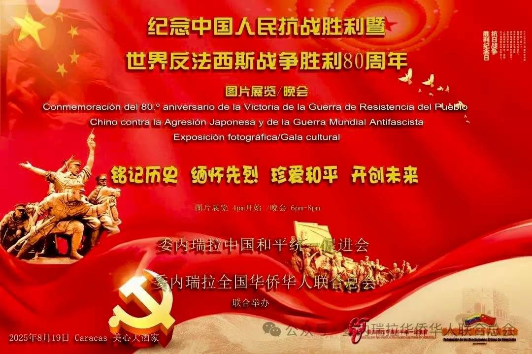 “历史不会被遗忘,和平必须永续。”当地时间8月19日,加拉加斯“美心大酒家”金色大厅庄严肃穆、花团锦簇,由委内瑞拉中国和平统一促进会、委内瑞拉全国华侨华人联合总会联合主办,《纪念中国人民抗日战争暨世界反法西斯战争胜利80周年》图片展览与文艺晚会在此隆重上演。