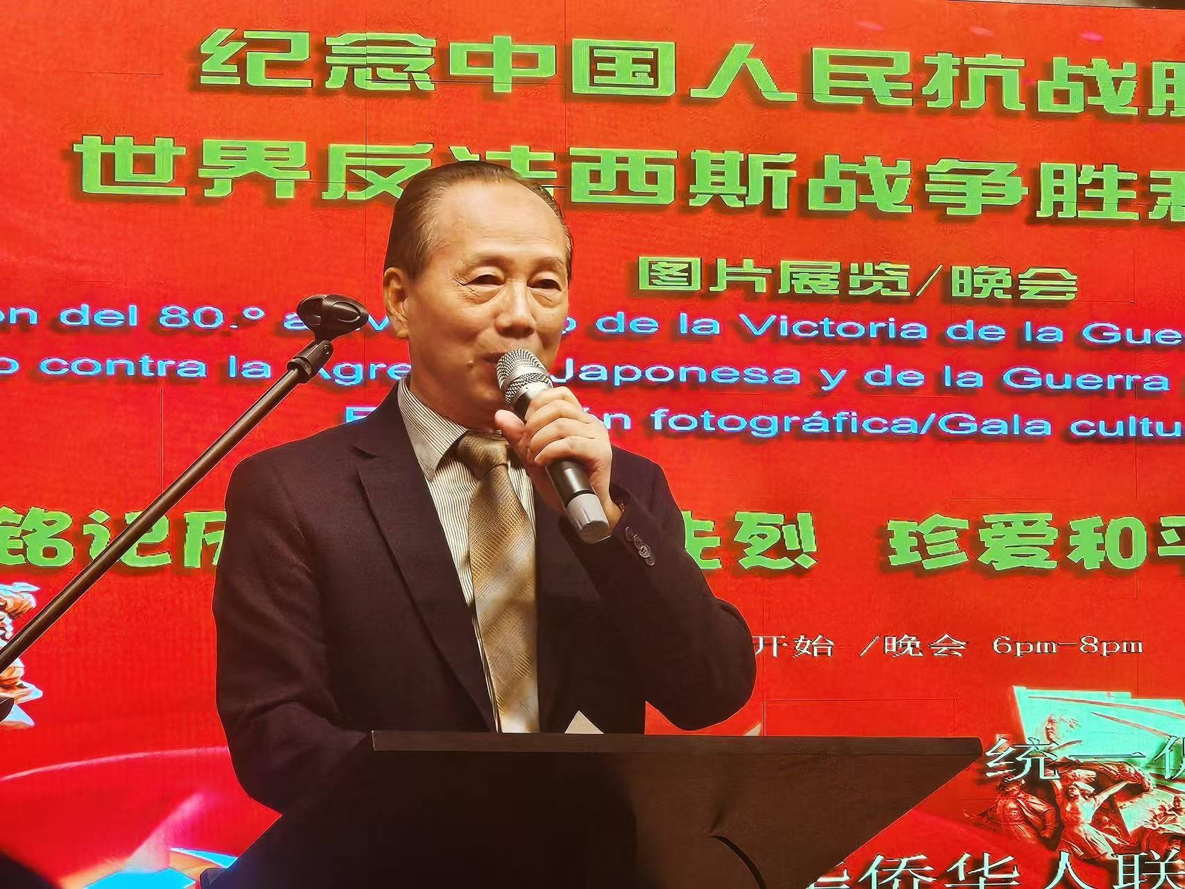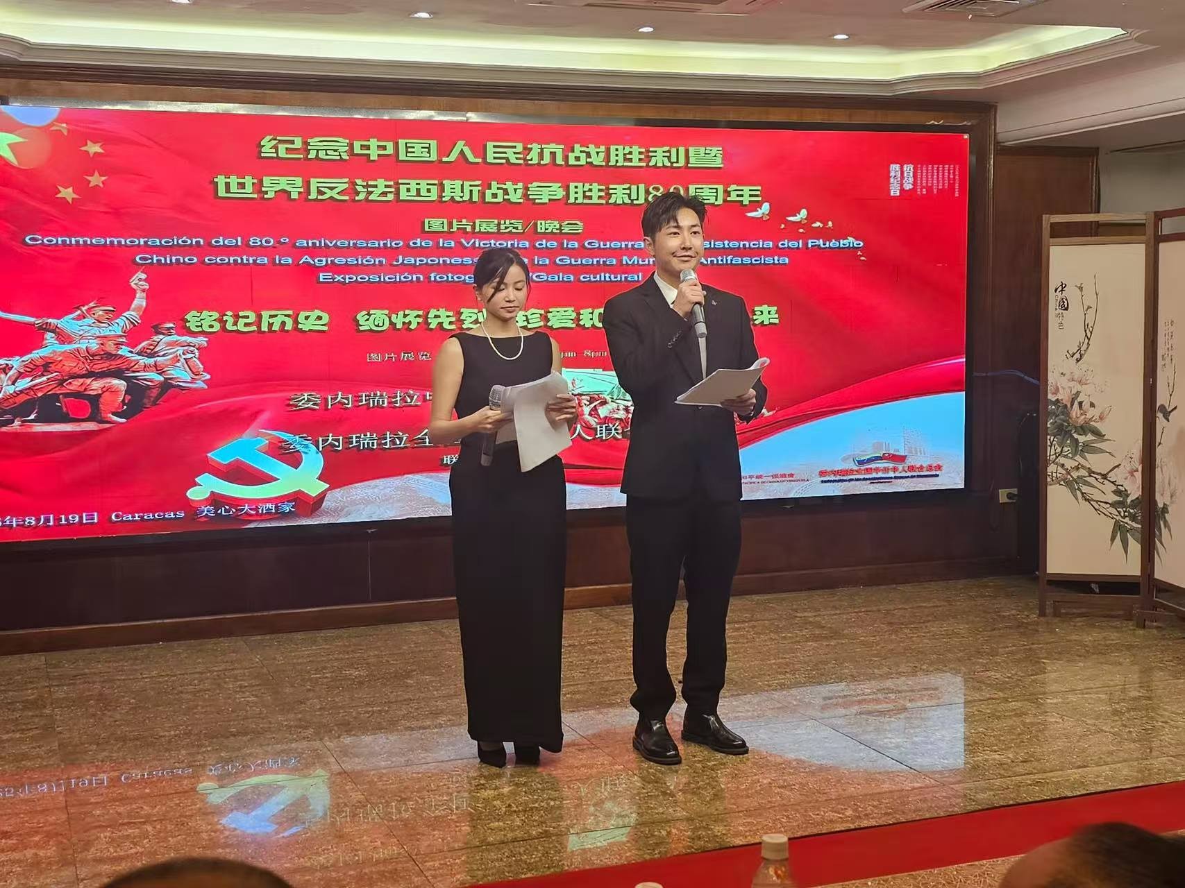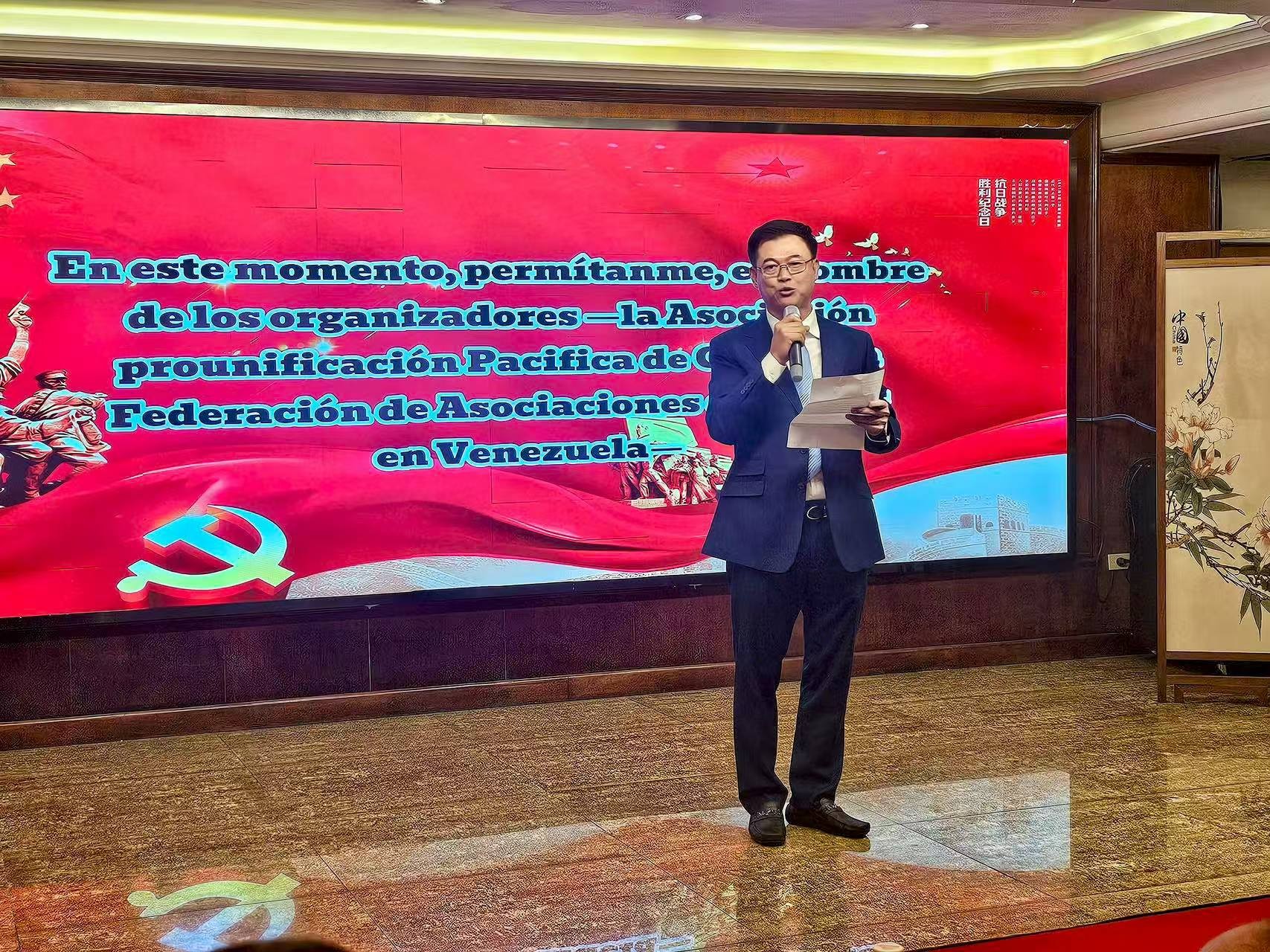 1. 岑明辉常务副会长:我们怀着无比崇敬的心情相聚于此,共同纪念中国人民抗日战争暨世界反法西斯战争胜利八十周年。作为活动筹办人,我谨代表委内瑞拉全体华侨华人,向所有为和平献身的先烈们致以最深切的缅怀!向到场的中委两国友人、侨胞兄弟姐妹们表示最热烈的欢迎! 八十年前,中国人民以三千万同胞伤亡的惨烈代价,赢得了近代以来抗击外敌入侵的第一次完全胜利。这场胜利不仅捍卫了中华民族的尊严,更以血肉之躯为世界反法西斯战争作出不可磨灭的贡献。今天的纪念,是对历史的铭记,是对"正义必胜、和平必胜、人民必胜"真理的庄严宣告! 现场西语同传,发言赢得了持续掌声。