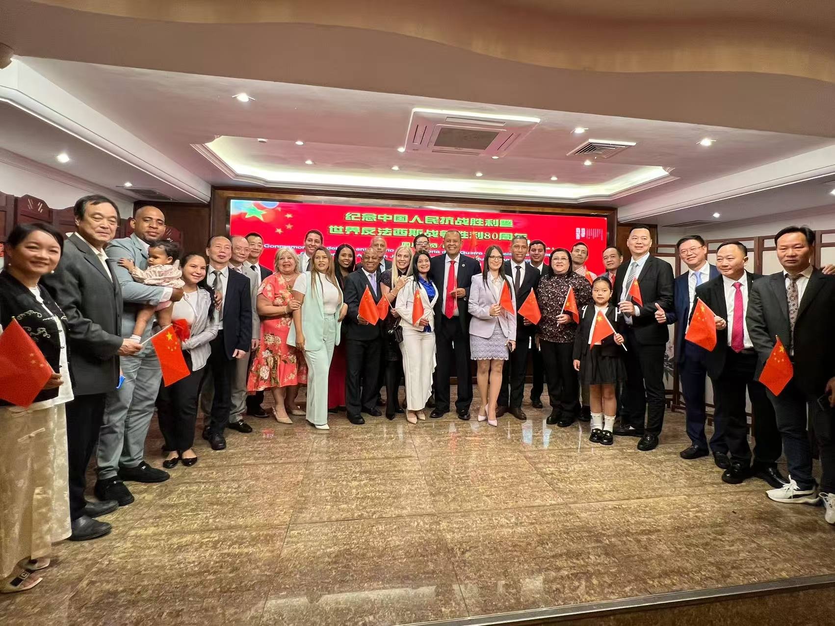 中国驻委内瑞拉特命全权大使蓝虎率公使衔参赞张元伟、领事部主任刘敏等外交官,与委内瑞拉全国代表大会(国会)议员格洛丽亚·卡斯蒂约(Diputada Gloria Castillo)、鲁道夫·桑斯(Diputado Rodolfo Sanz)及20多位跨党派议员,委内瑞拉中国和平统一促进会(简称“委和统会”)执行会长陈伟嶙、常务副会长岑明辉、方健新,委内瑞拉全国华侨华人联合总会(简称“联合总会”)第一副主席郑文辉,以及来自全国各省、侨团的200余名侨领代表齐聚一堂,共同回望80年前那段艰苦卓绝的烽火岁月,向世界发出“铭记历史、珍爱和平、促进统一”的响亮呼声。
