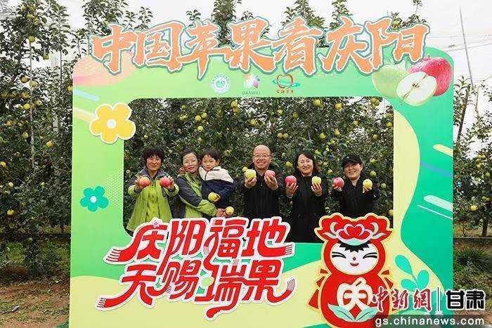 游客在“庆阳福地·天赐瑞果”苹果示范基地打卡留影。赵彩霞 摄