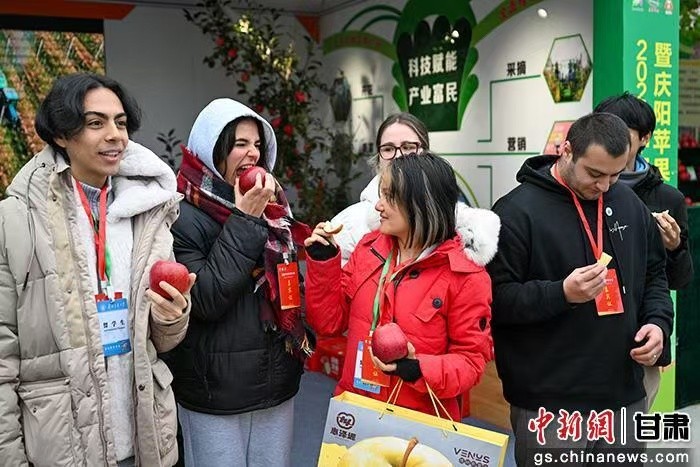 图为参加2025中国苹果年会的国外友人品尝庆阳苹果。俄少飞 摄
