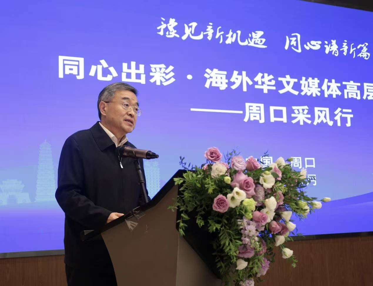 周口市委常委、统战部部长皇甫立新在致辞中向华媒高层重点推介了周口三张熠熠生辉的名片:商贸物流繁荣之地、历史文化厚重之地、产业发展迅速之地。“今天的周口站在了全面推进现代化建设的新起点,正锚定“1+2+4+N”目标任务体系和“16232”总体工作思路,奋力谱写中原大地推进中国式现代化周口新篇章。”皇甫立新诚邀华文媒体深入考察周口的产业优势、区位优势、交通优势、文旅优势,大力宣传周口的悠久历史、灿烂文化,大力推介周口的营商环境、巨大商机,让更多人了解周口、奔赴周口、投资周口。