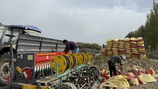 农户们与大型播种农机协同作业,冬小麦播种工作有序推进。祖丽皮耶 摄