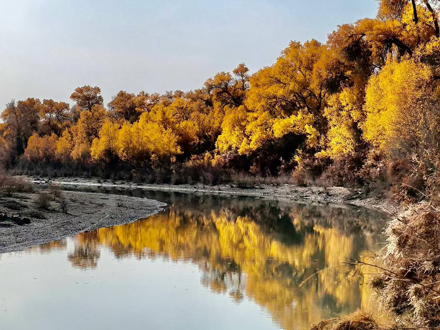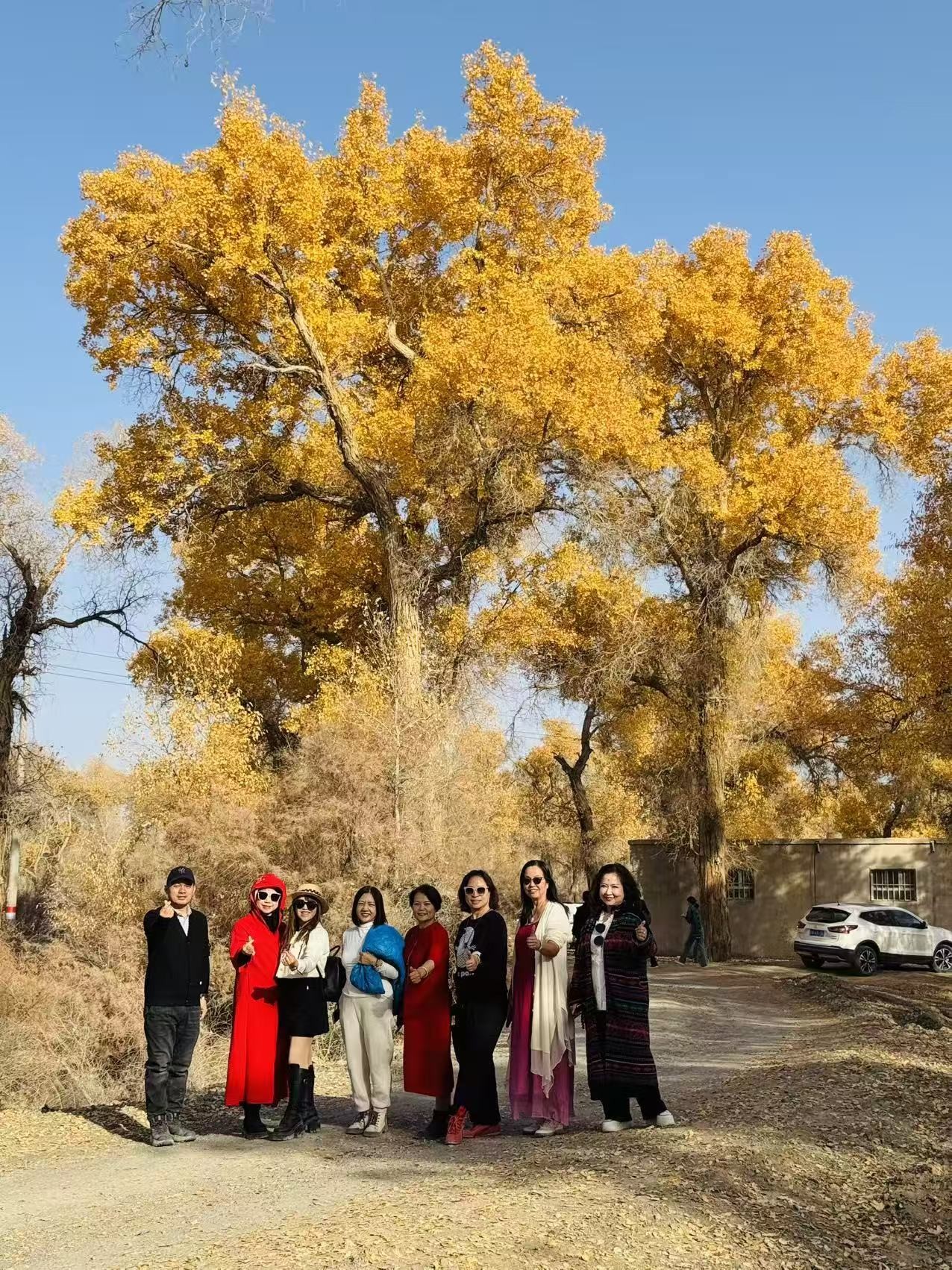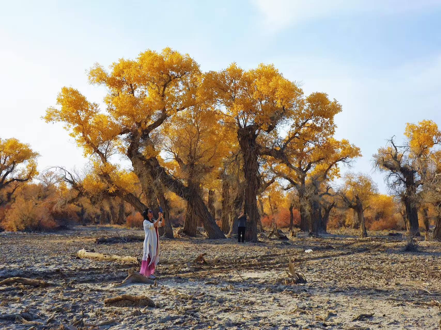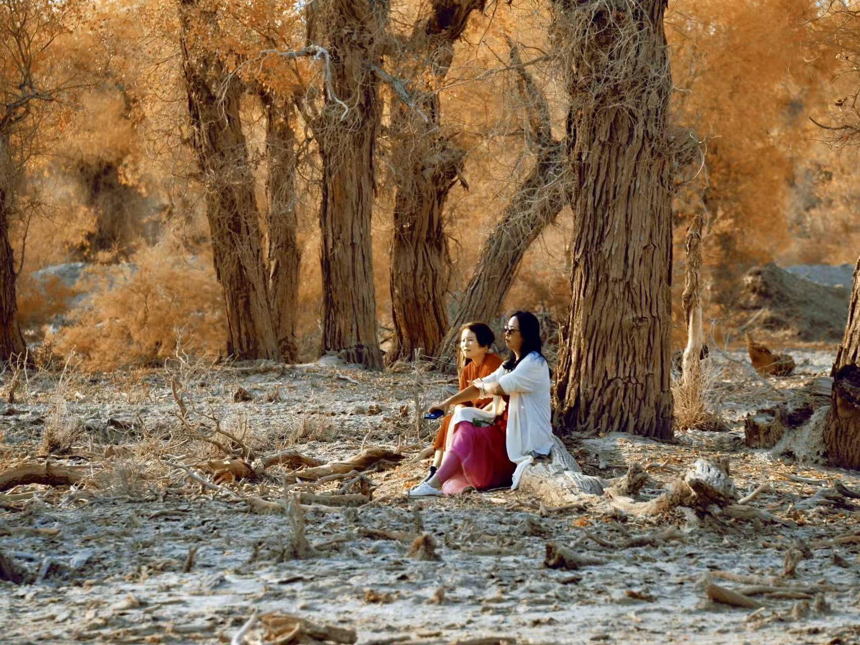 来之前做的拍摄攻略,此刻显得如此苍白无力。我举起手机,试图记录这壮美瞬间,却在取景框里恍惚——这天地间的磅礡之美,哪是镜头所能承载?于是放下手机,只是静静地走,细细地看,累了,坐在胡杨树下,任由身心沉浸在这场盼了两年的秋日盛宴中。法国法中网副总编文化州在一旁轻声感叹道:“我们带着手机来,原是想定格美,可最终被定格的,却是我们自己。”