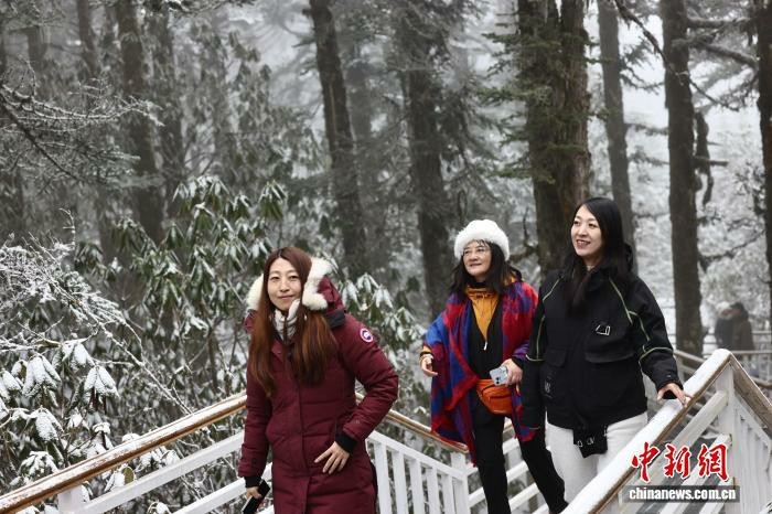 11月12日,2025海外华文媒体甘孜行参访团走进位于四川省甘孜州的海螺沟景区,领略景区的初冬之美。海螺沟景区拥有山岳冰川、大冰瀑布、生态植被等景观,也是世界上仅存的低海拔冰川之一。图为海外华媒代表在海螺沟景区一观景台上拍摄。中新社记者 王磊 摄
