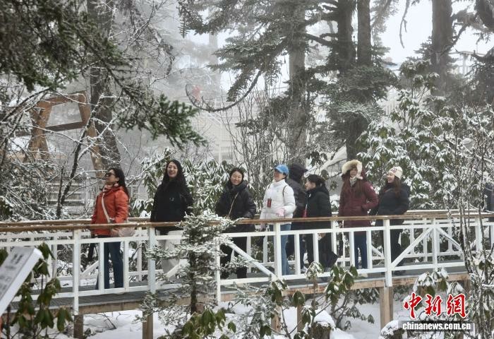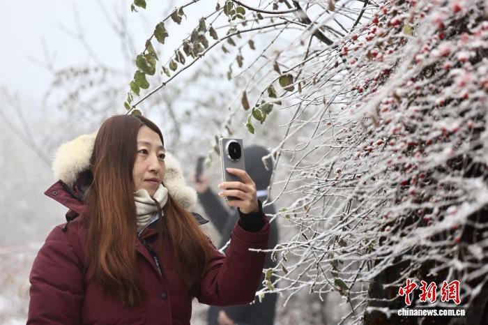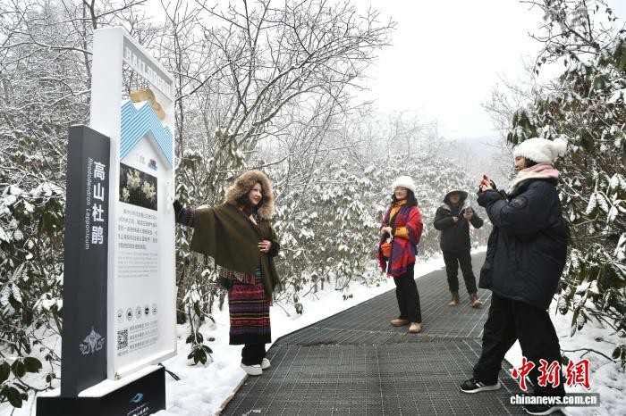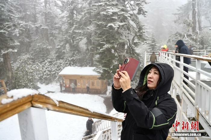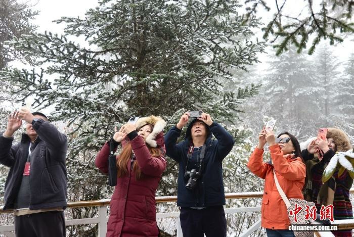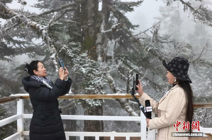图为一位海外华媒代表在海螺沟景区拍摄雪景。中新社记者 王磊 摄