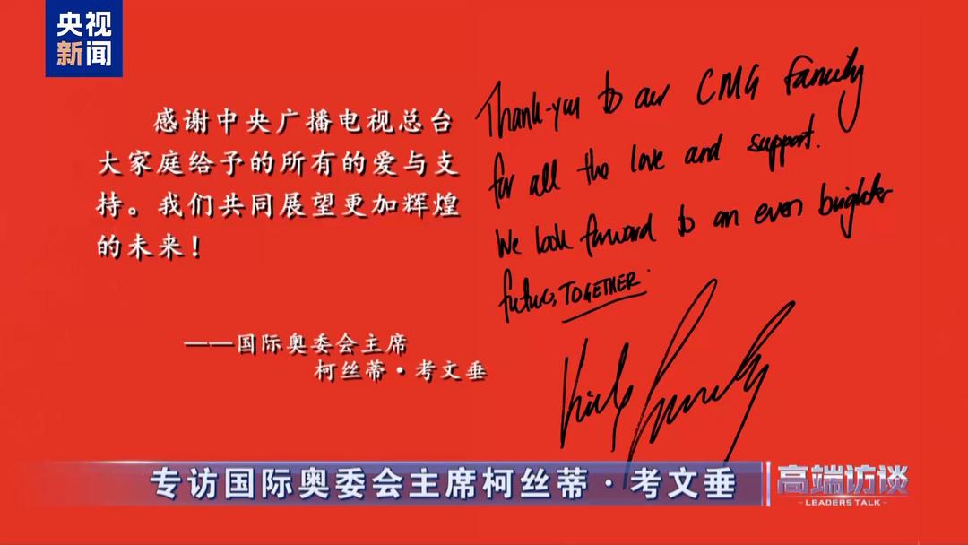 国际奥委会主席柯丝蒂·考文垂在接受总台专访后题词: