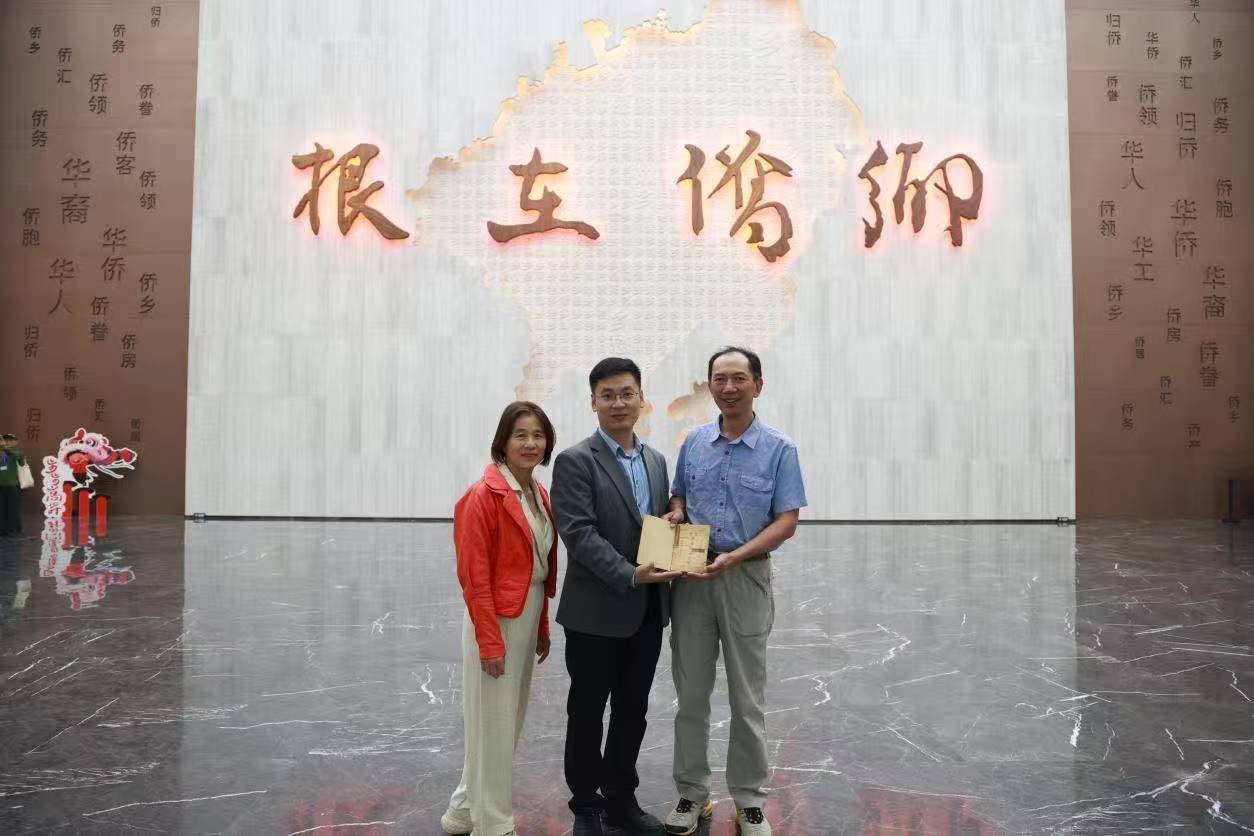 其后,在江门市侨联副主席利俊义、余泽权等领导陪同下,张江平先生伉俪参观了国家一级博物馆中国侨都华侨华人博物馆。穿行在博物馆期间,馆藏的一件件泛黄的侨批、一幅幅生动的历史图片、一幕幕还原的场景,无声地诉说着五邑先侨们背井离乡、奋斗海外、心系桑梓、报效家国的感人故事。张江平先生对侨博馆的布展内容深受感动评价很高,最后决定把珍贵百年侨史典籍《最新华英会话全璧》原本捐赠给中国侨都华侨华人博物馆。高东辉馆长接受捐赠并向张江平先生颁发了捐赠证书。