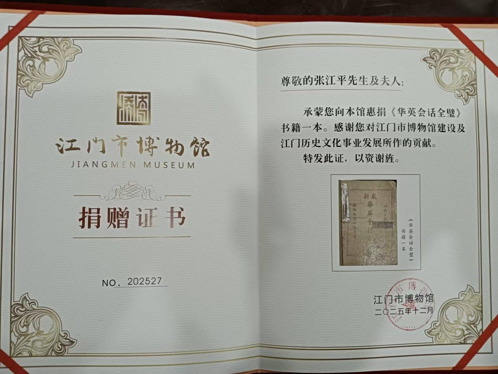 今年12月,祖籍广东开平的澳大利亚华人张江平先生及其夫人一行到访江门市侨联,在座谈中表示要向江门市文博部门捐赠其珍藏多年的侨史文献典籍、1925年在海外出版的《最新华英会话全璧》一书。江门市侨联对此深表感激。