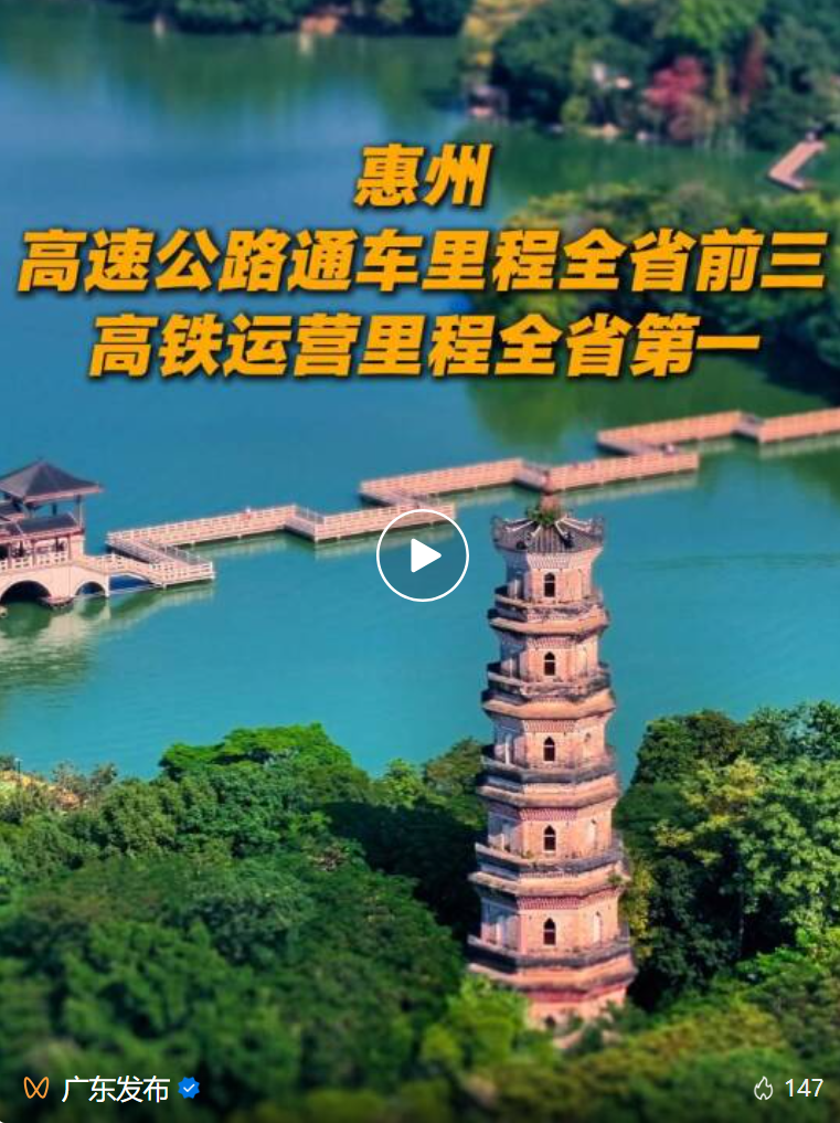 惠州市交通运输局局长严文生表示,“十四五”以来,全市交通基础设施建设累计完成投资1800亿元,较“十三五”时期翻了一番。高速公路通车里程930公里,居全省第三,其中“十四五”时期新建成4条,通车里程204公里;在建4条,里程207公里,打造连通广州、深圳和粤东西北的“丰”字交通主框架,打造市区“两环十射”快速路网,构建便捷高效的高快速立体交通网。高铁通车里程258公里,居全省第一,广惠城际“四线”贯通、“五城”联运。