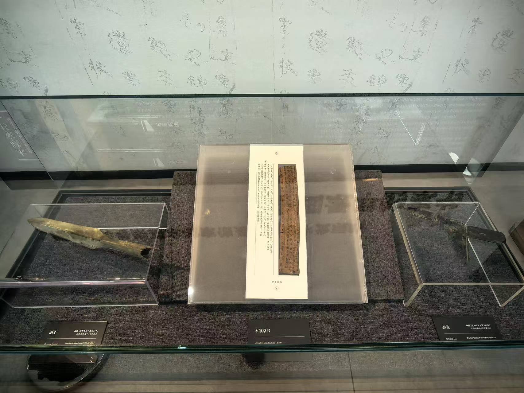 馆内,“黑夫木牍”静静陈列,这是中国现存最早的家书实物。公元前223年,秦灭楚前线的士兵“黑夫”与“惊”,在木牍上写下359字秦隶,向家中兄长“衷”问安、求寄衣物钱粮,字里行间满是战火中的亲情与牵挂,让冰冷的历史有了温度和心跳。一枚木牍边缘的反复摩挲痕迹,见证着兄长对家书的珍视,也让2200多年前的普通人故事跃然眼前。