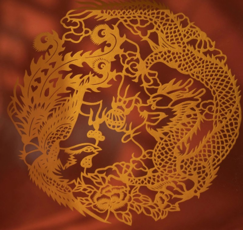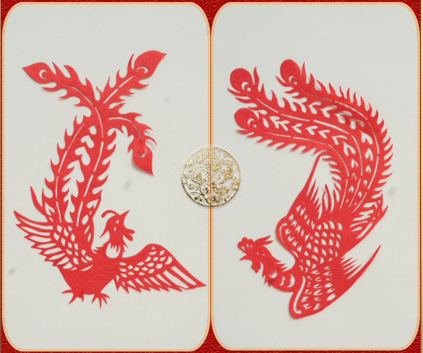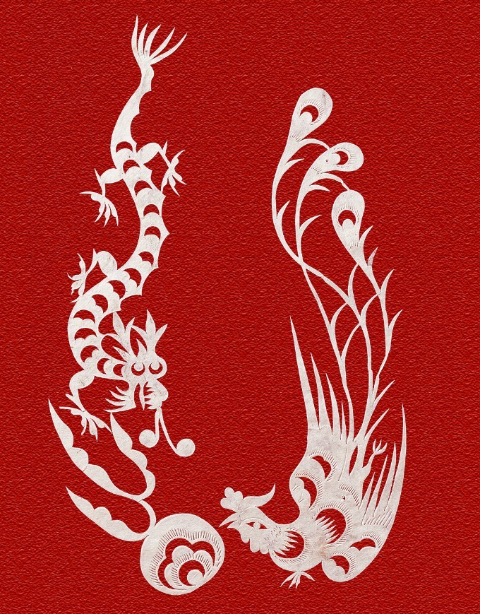 剪纸作品中常借动物、植物等形象表达意愿,如:龙,是权力、威望的象征;凤,太阳、火和各种鸟的复合图腾,神灵的化身。“龙凤呈祥”又被用来象征夫妻的美满生活和百年好合的情意,表示对新人的祝福,龙飞凤舞的大红剪纸是新婚、欢悦、幸福、美满的象征。“鱼跃龙门”则象征更上一层楼,飞腾跳跃,越过龙门,改变命运,前途飞跃”,表示对自己前程的一种向往憧憬之情。松树、仙鹤、寿桃、老寿星等图纹,表达的是祝贺延年益寿的主题思想。