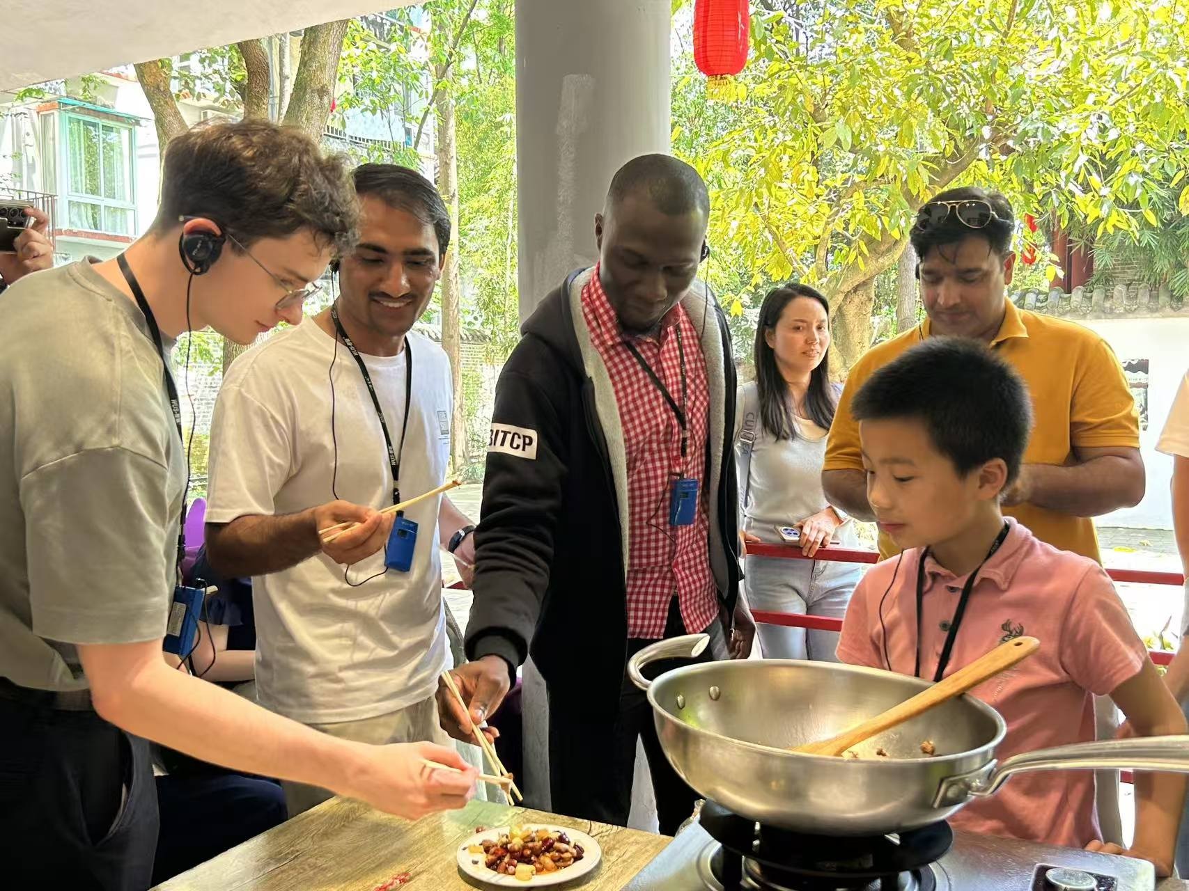 结束古城非遗博物馆的体验后,留学生们走进成都川菜博物馆,依次参观典藏馆、传统豆瓣晾晒场,近距离观摩川菜大厨现场烹制经典川菜,亲口品尝地道川味佳肴,在“一菜一格、百菜百味”的独特魅力中深度感知郫都饮食文化的深厚底蕴。