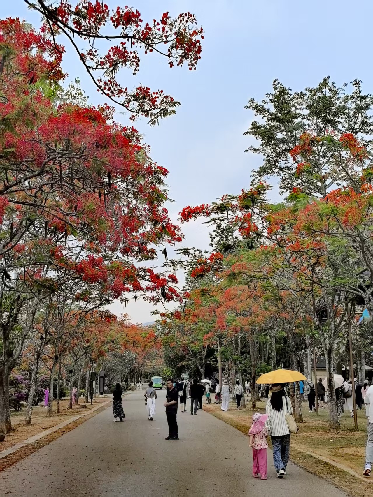 此时,园区内的凤凰木正值盛花期,火红的蝶形花冠缀满枝头,形如丹凤展翅,摇曳生姿,与澄澈蓝天、葱郁绿意相映成趣,成为园区内一道醒目的风景线。不少代表驻足停留,用镜头定格这火红的盛景,赞叹这是版纳最动人的欢迎仪式。