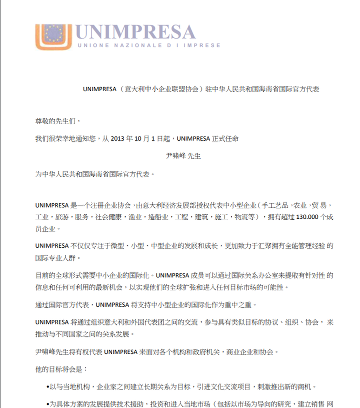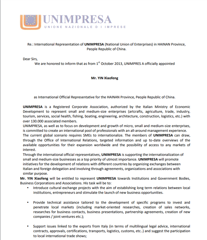 据意大利中小企协会联盟驻海南办事处国际官方总代表尹啸峰介绍,意大利中小企协会联盟(UNIMPRESA)是一个注册企业协会,由意大利经济发展部授权代表中小型企业(手工艺品,农业,贸 易,工业,旅游,服务,社会健康,渔业,造船业,工程,建筑,施工,物流等),拥有超过 130.000个成员企业。不仅仅专注于微型、小型、中型企业的发展和成长,更加致力于汇聚拥有全能管理经验 的国际专业人群。目前的全球形式需要中小企业的国际化。UNIMPRESA成员可以通过国际关系办公室来提取有针对性的信息和任何可利用的最新机会,以实现他们的全球扩张和进入任何目标市场的可能性。