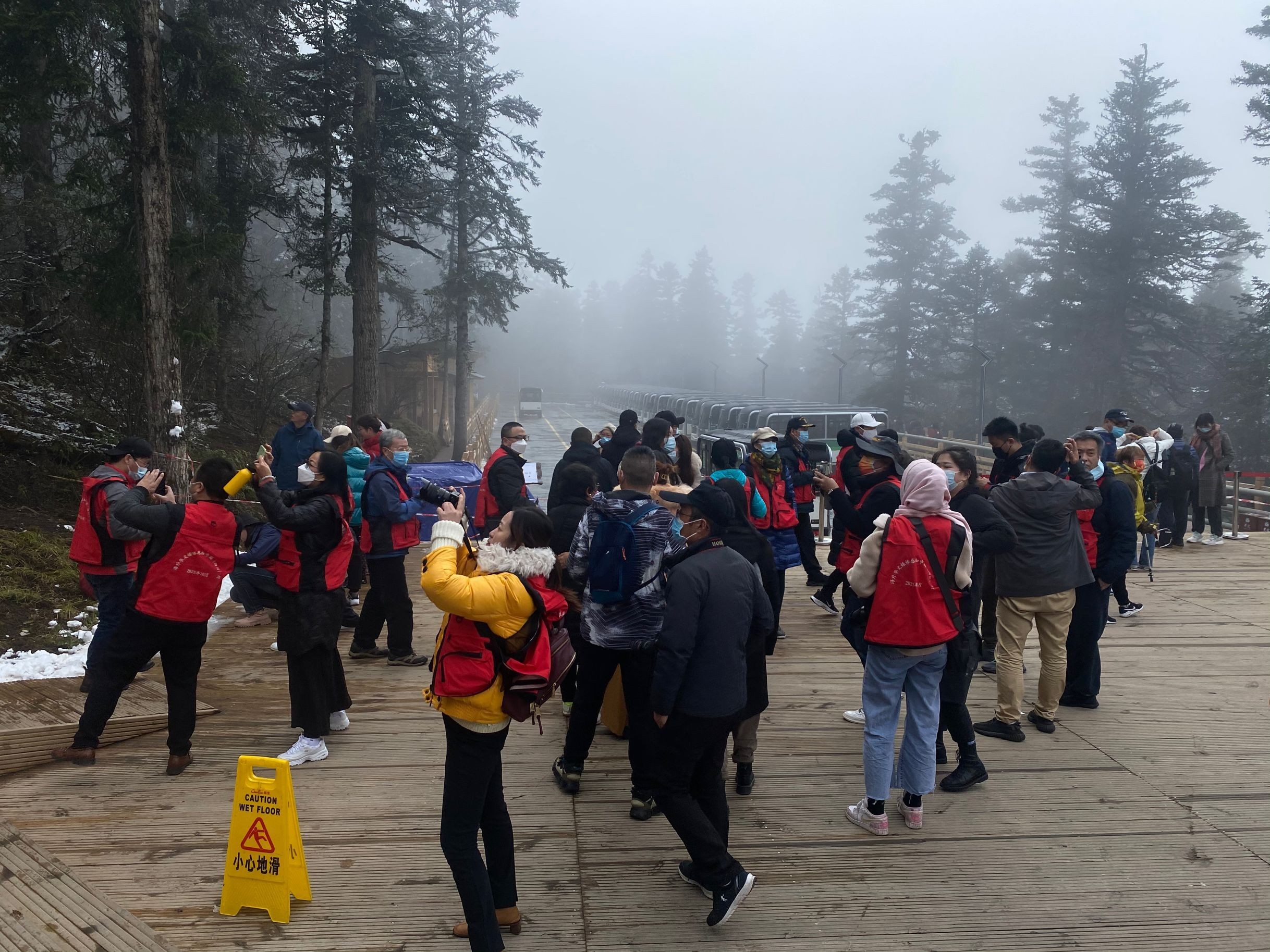 当日正值深秋,虽然气温较低,但游客们的热情依然高涨。游人如织,但黄龙风景名胜区内防疫工作仍然有序开展。海外华文媒体一行看到,游人们均佩戴着口罩,在开心游览的同时,仍然保持了较好的社交距离。