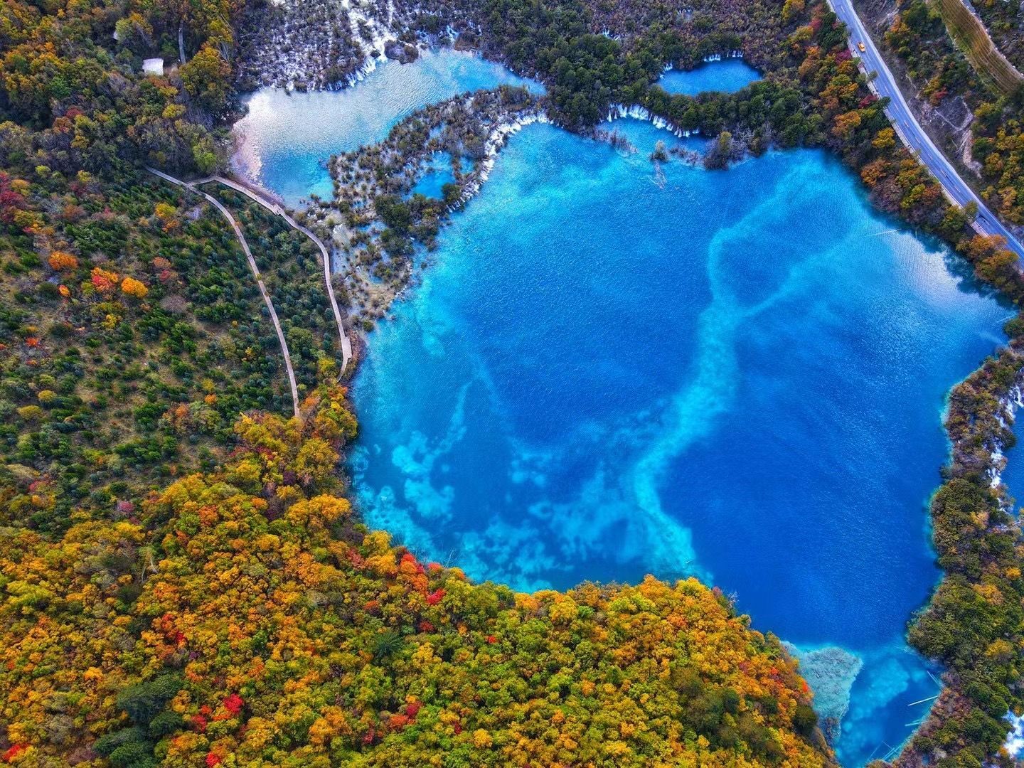 这些水生群落所含叶绿素深浅不同,在富含碳酸钙质的湖水里,能呈现出不同的颜色。冬季四周冰天雪地,而这个五彩斑斓的小池子却不冻冰,甚为奇绝。