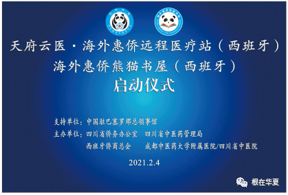 由四川省侨办牵头,四川省中医药管理局、四川省中医院共同参与建设的全球首个“天府云医·海外惠侨远程医疗站”2021年2月4日在四川省中医院和西班牙侨商总会会馆成功连线、正式启用。中国驻巴塞罗那总领事林楠,四川省侨办主任文甦,四川省中医药管理局局长田兴军,四川省中医院院长谢春光、党委书记常德贵以及西班牙侨商总会会长金浩等旅西侨胞在线出席启动仪式。