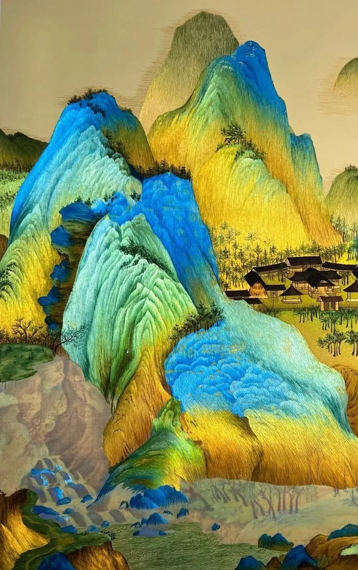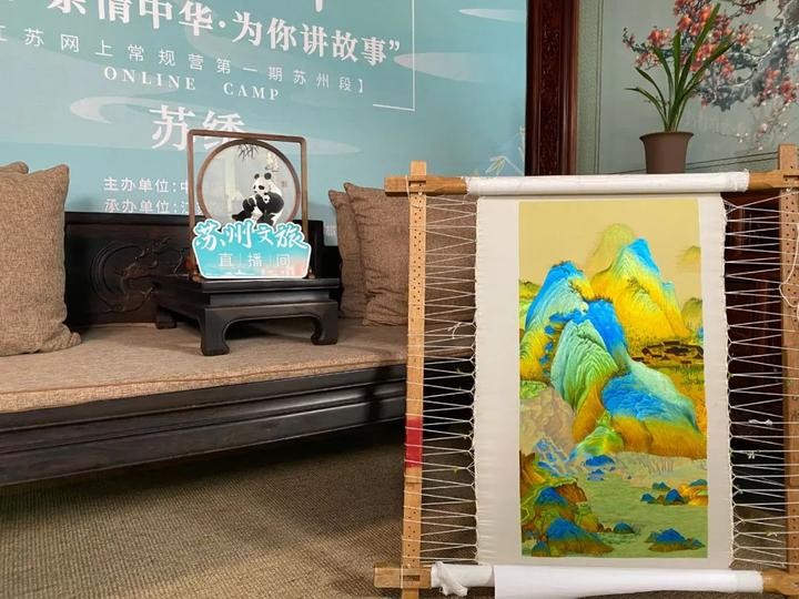 最后,一幅以中国传统青绿山水《千里江山图》为内容创作的苏绣作品以高超的技艺和绝佳的视觉体验引起了直播间的热烈讨论,绣品对青绿色彩的把控给小营员带来极致的视觉体验,对东方美学的赞叹在直播间经久不息。