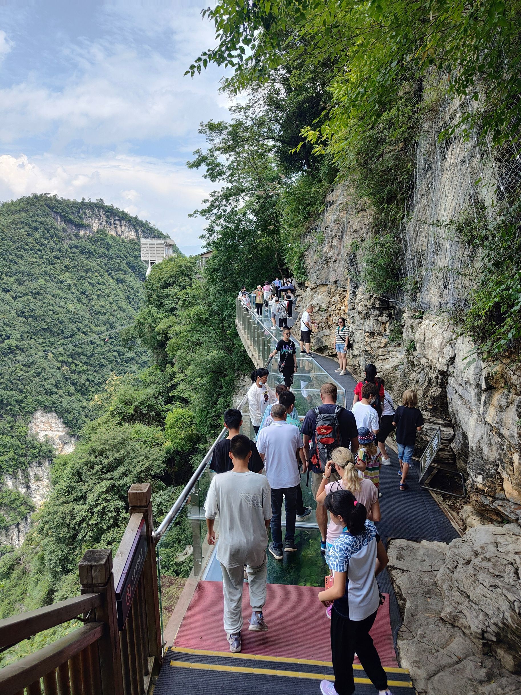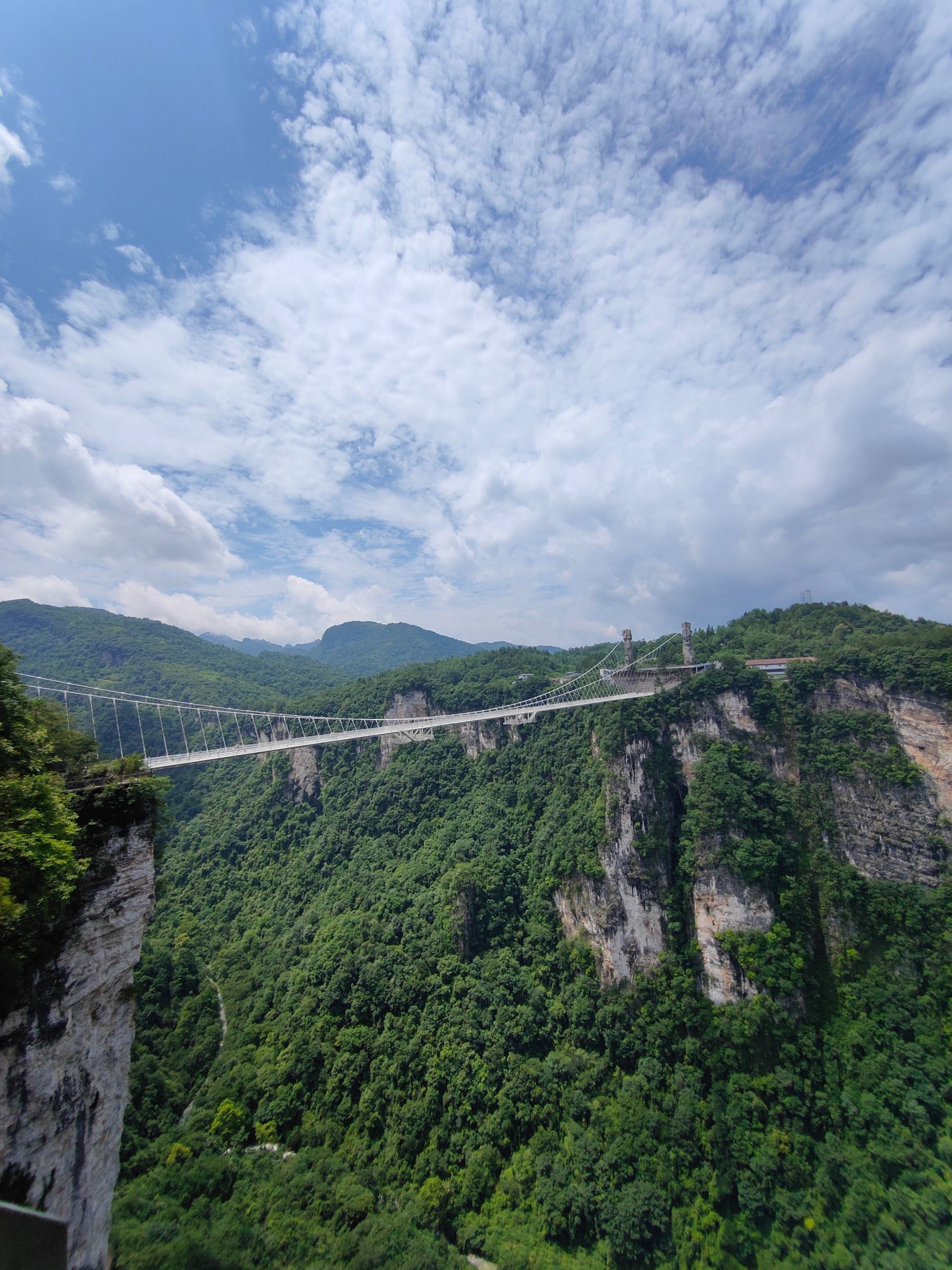 张家界大峡谷玻璃桥全长430米,桥面宽6米,桥面距谷底约300米,是目前世界最长、最高的全透明玻璃桥及世界首座斜拉式大变量空间索玻璃吊桥。具有蹦极、溜索、舞台表演等多种功能。国内外桥梁专家评价称“张家界大峡谷玻璃桥是世界桥梁建筑史上的奇迹”。