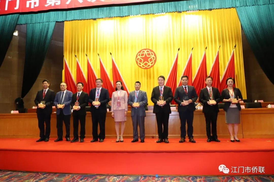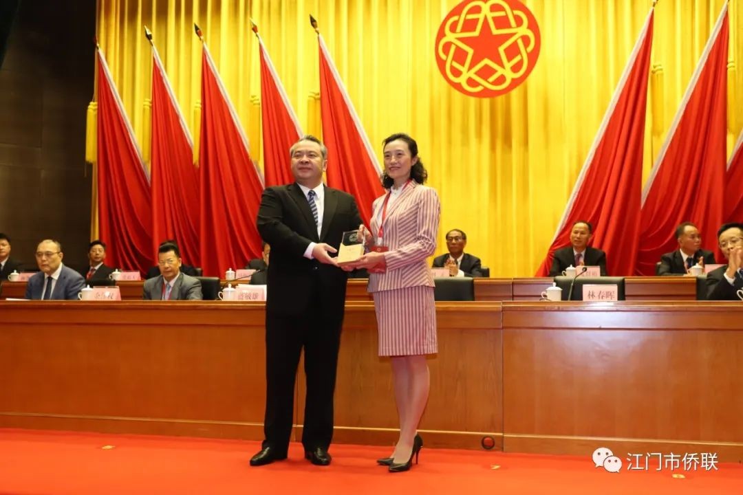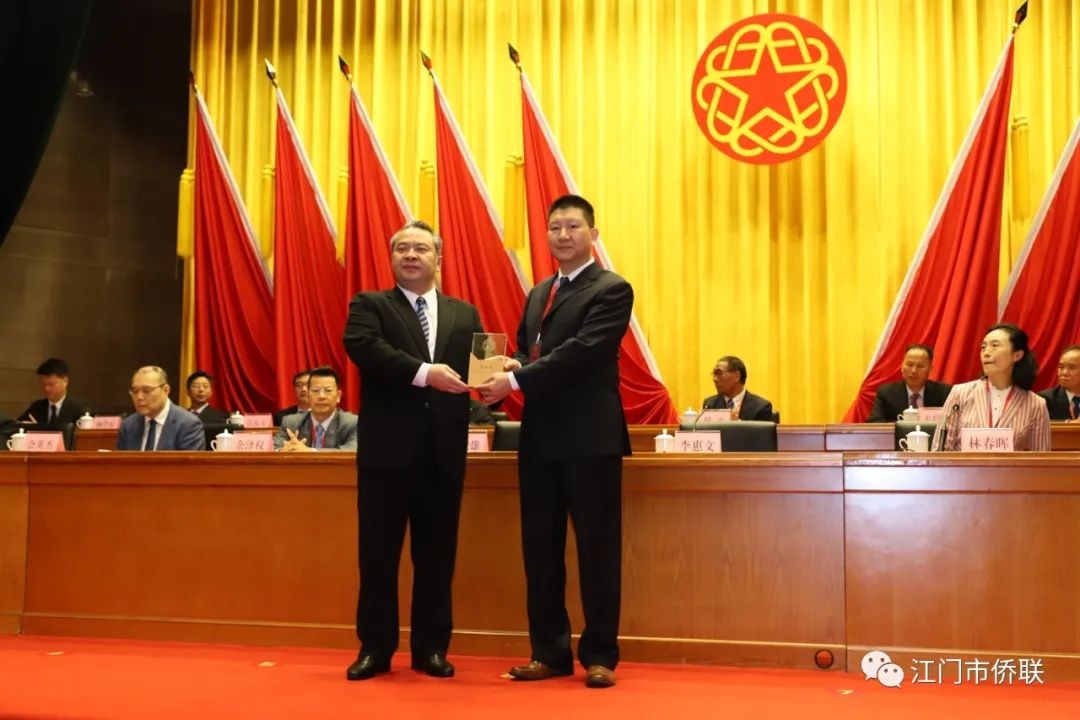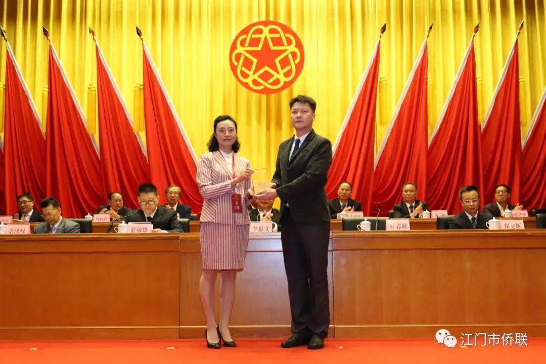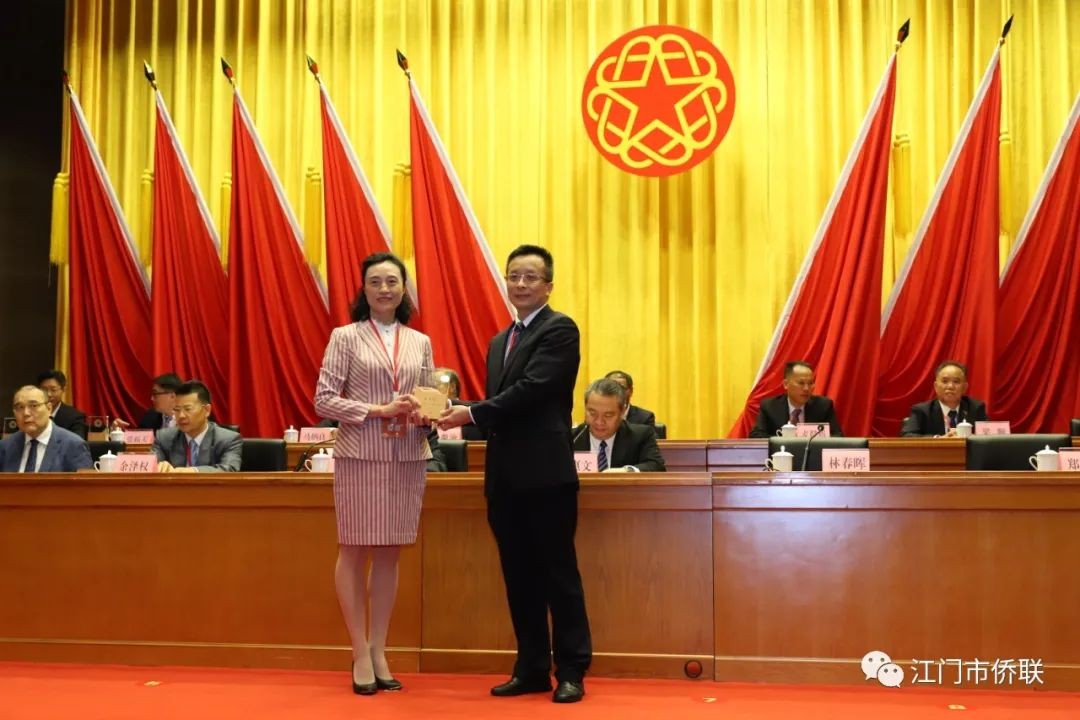 △市委常委、统战部部长李惠文向新当选江门市侨联主席林春晖颁发证书