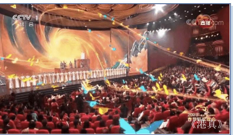 比如在戏曲《华彩梨园》中,现代AR技术首次与中国传统戏曲结合,为其在舞台上搭建了一个“大戏楼”;武术《演武》中,AR技术构建出的四季轮转则与武僧刚柔并济的招式共同营造出一份“心似白云常自在,意如流水任东西”的挥洒自如之感;“南音”节目《百鸟归巢》中,AR技术让五彩绚丽的百鸟舞动翅膀,让人联想到“鸟随鸾凤飞能远,人伴贤良品自高”。