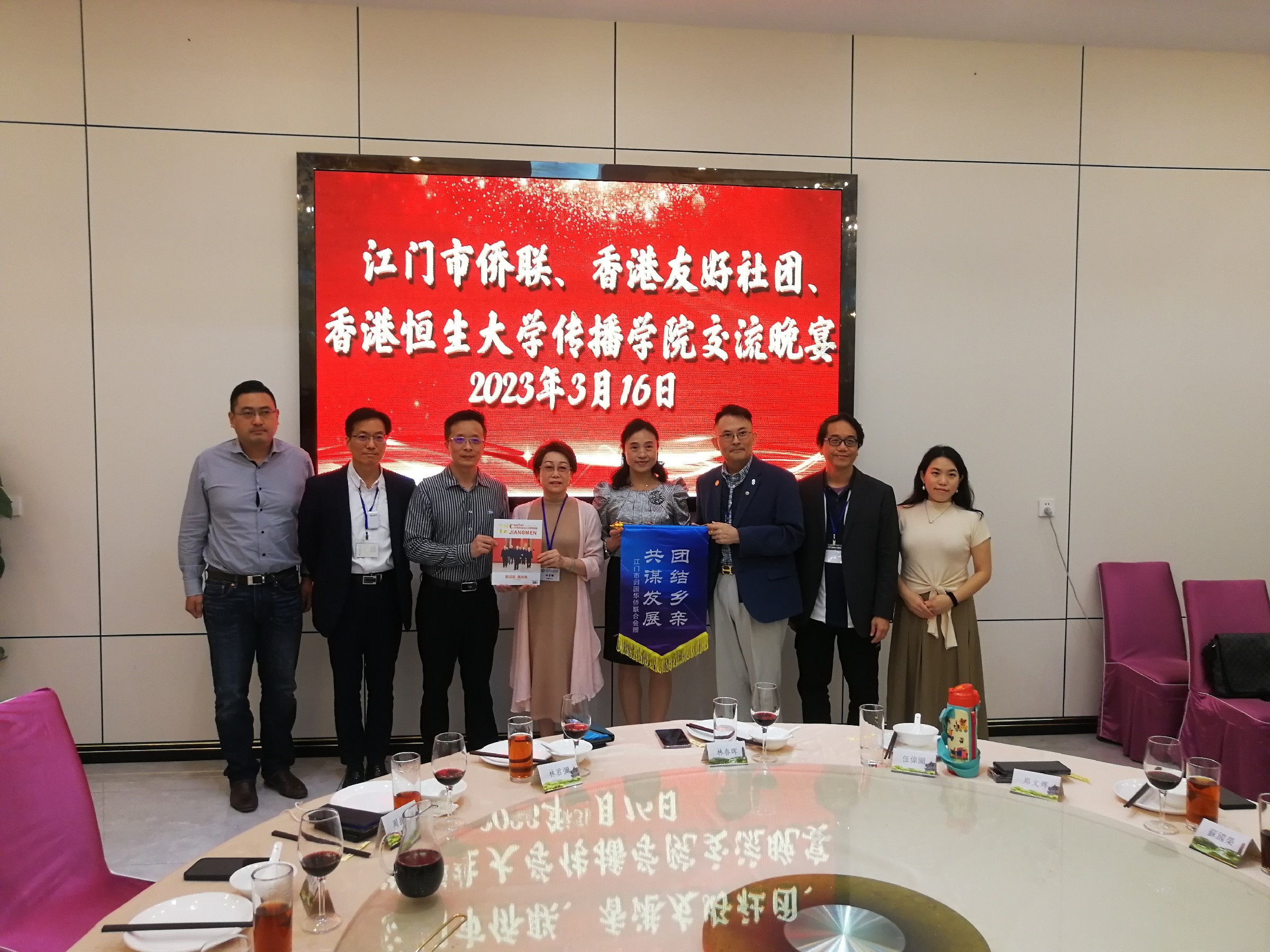 联欢座谈会上,江门市侨联副主席郑文辉致辞,他向香港来宾们通报了今年江门市委、市政府将举全市之力推进“侨都赋能”和“港澳融合”工程,并定于今年4月8-12日举办首届RCEP(中国·江门)国际商品博览会暨第十二届珠中江进出口商品展销会,届时海内外华商将云集江门,江门市侨联诚挚邀请各位社团首长积极发动港商参展,同时邀请香港同胞常来江门看看,共同推动江门经济高质量发展。江门市侨联同时对本次活动提出三点希望:一是希望通过本次活动提高香港各友好社团对江门的认识,增强认同感;二是希望恒生大学的同学们深入了解江门市创新创业政策,毕业后能到江门创业发展;三是希望香港江门五邑两联总会继续发挥桥梁纽带作用,推动江港社团联谊交流。两小时的联欢座谈会乡情洋溢、气氛热烈、发言踊跃、畅所欲言,江门市侨联与香港江门五邑侨联联谊总会、香港江门五邑同乡联谊总会、香港恒生大学传播学院等香港社团互赠纪念品。