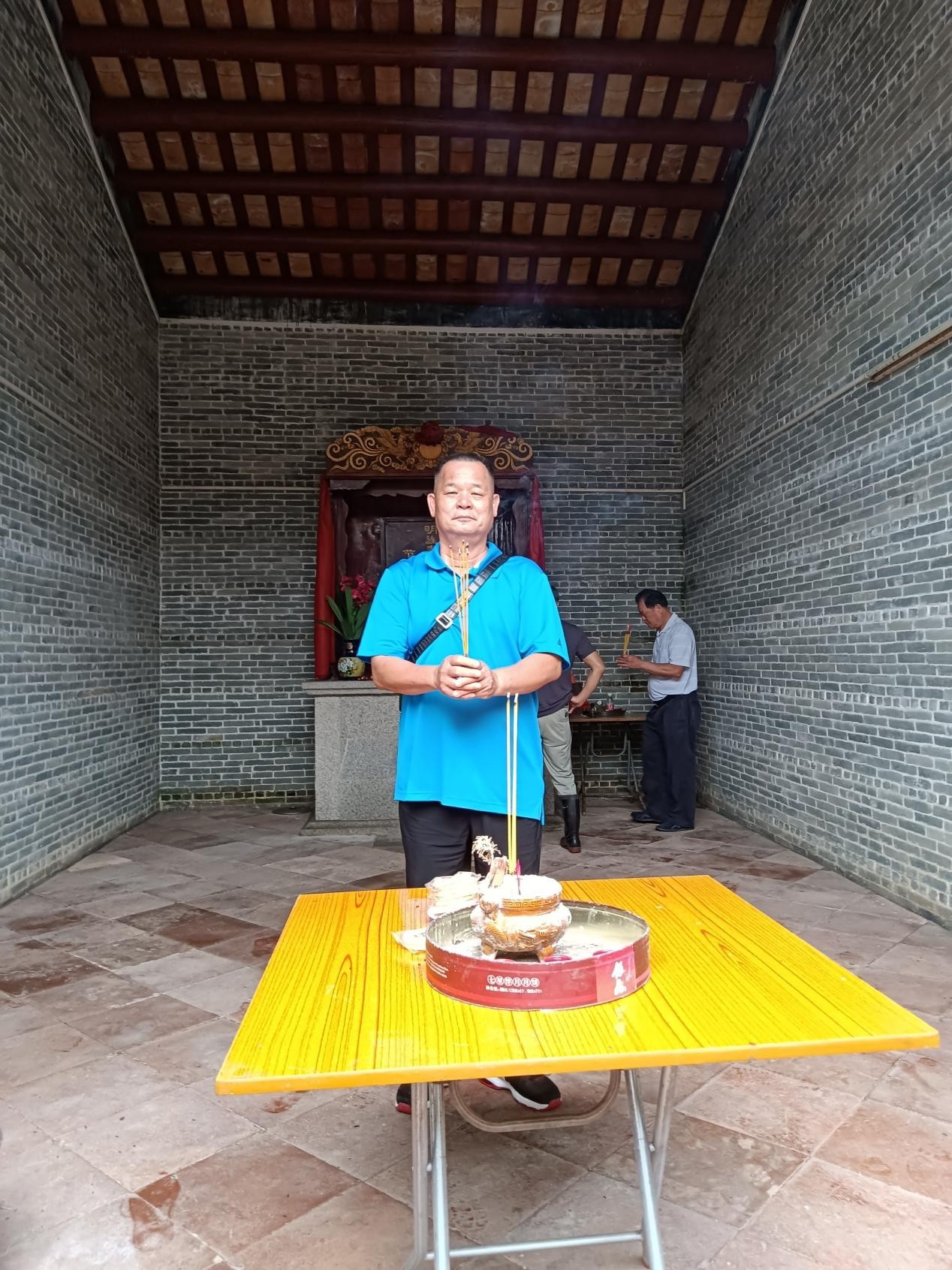 图为聂国常先生在新会梅湾村聂氏宗祠虔诚上香