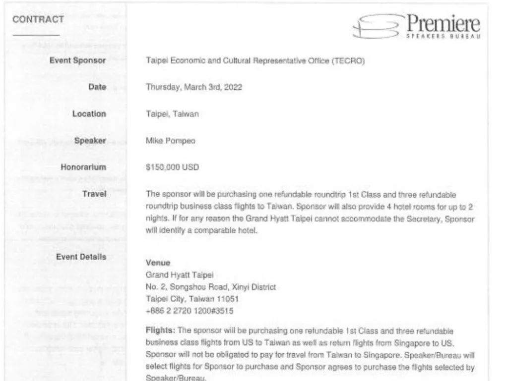 蓬佩奥在台期间,叫嚣所谓“美国应外交承认台湾”。媒体随即爆出一份台湾当局“驻美国经济文化代表处”与一家公关公司的合约,显示蓬佩奥为此“演讲”收取了台湾方面15万美元的酬劳。