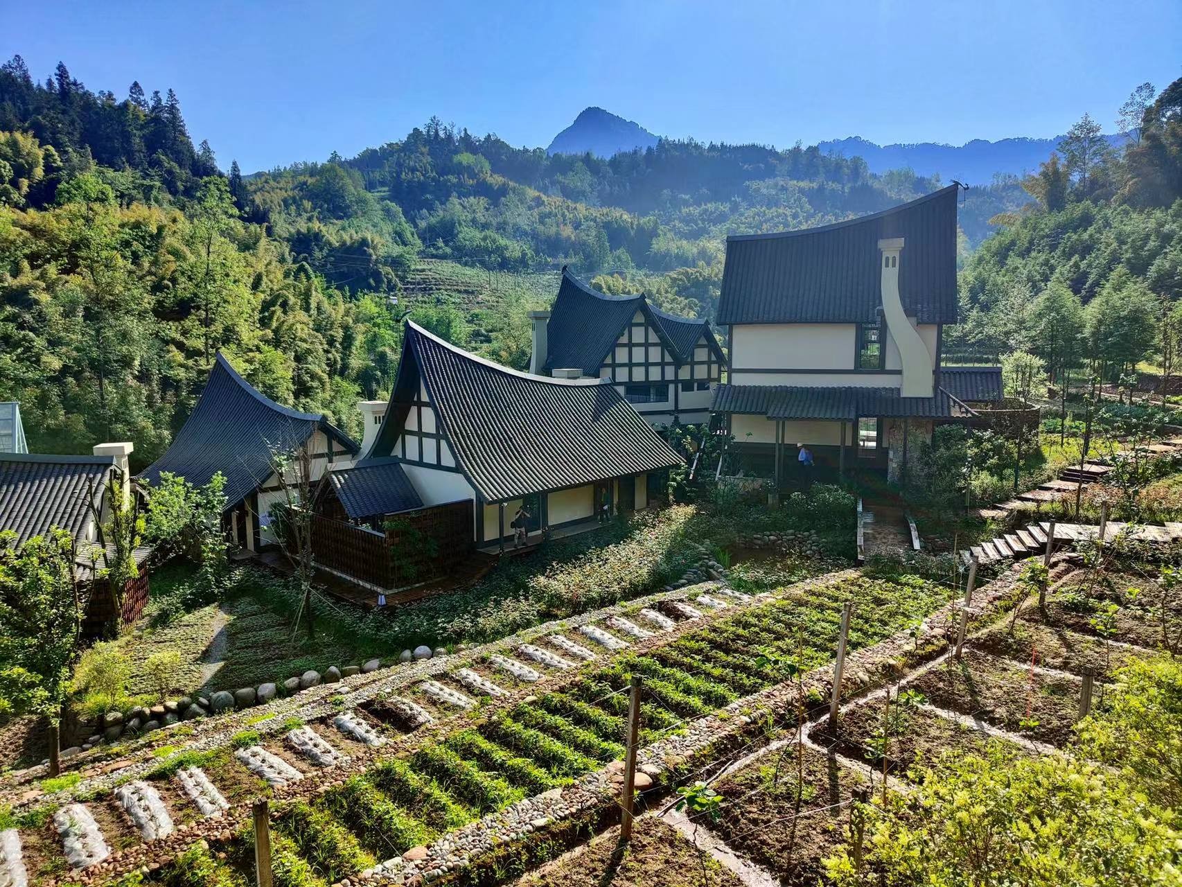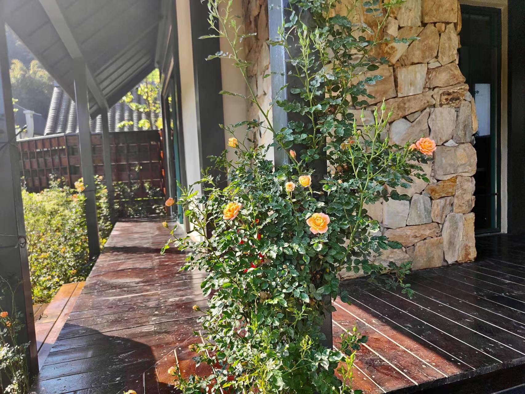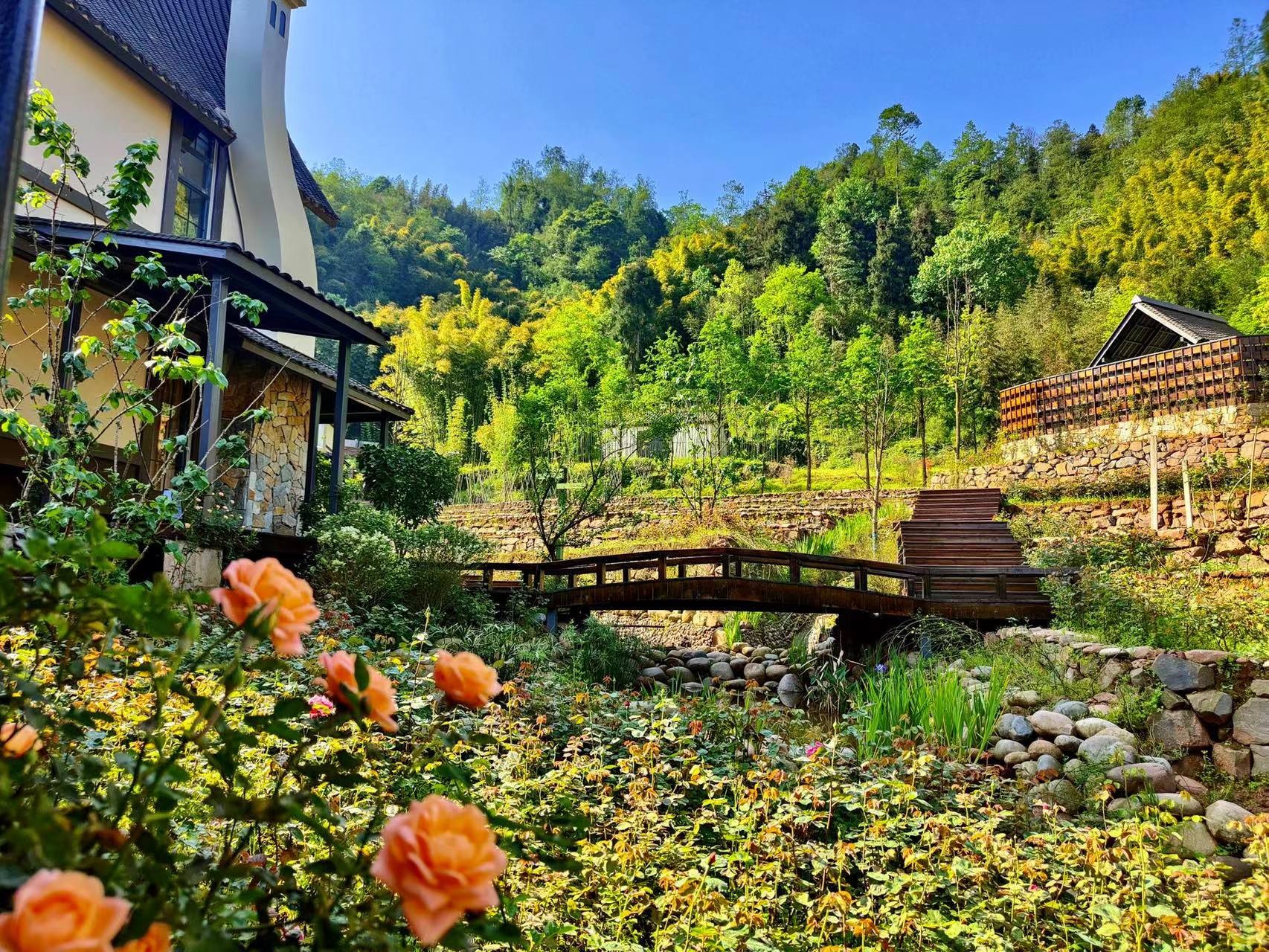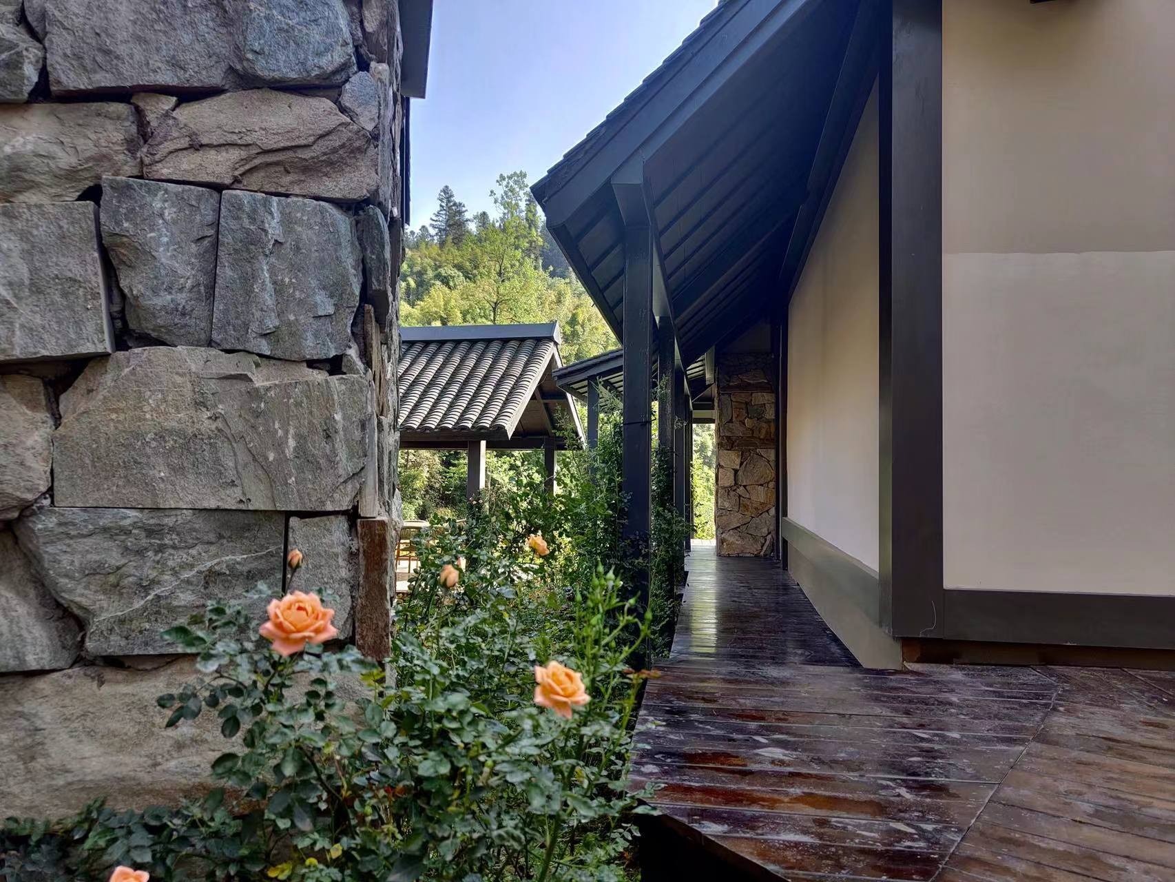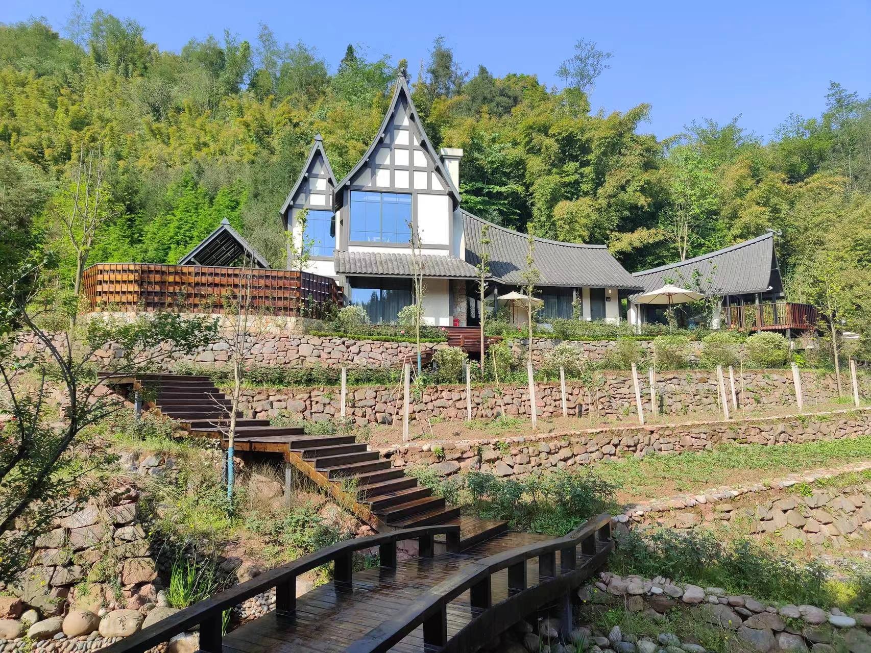 其中,“十里芳菲·野玫瑰村”是一个围绕“温泉泡汤”而形成独特生活方式的村落,该温泉是高温优质医疗级热温泉。穿过走廊,山野间出现了一栋栋独具风格的合院,每一个合院带有庭院、川式檐廊和天然温泉汤池。
