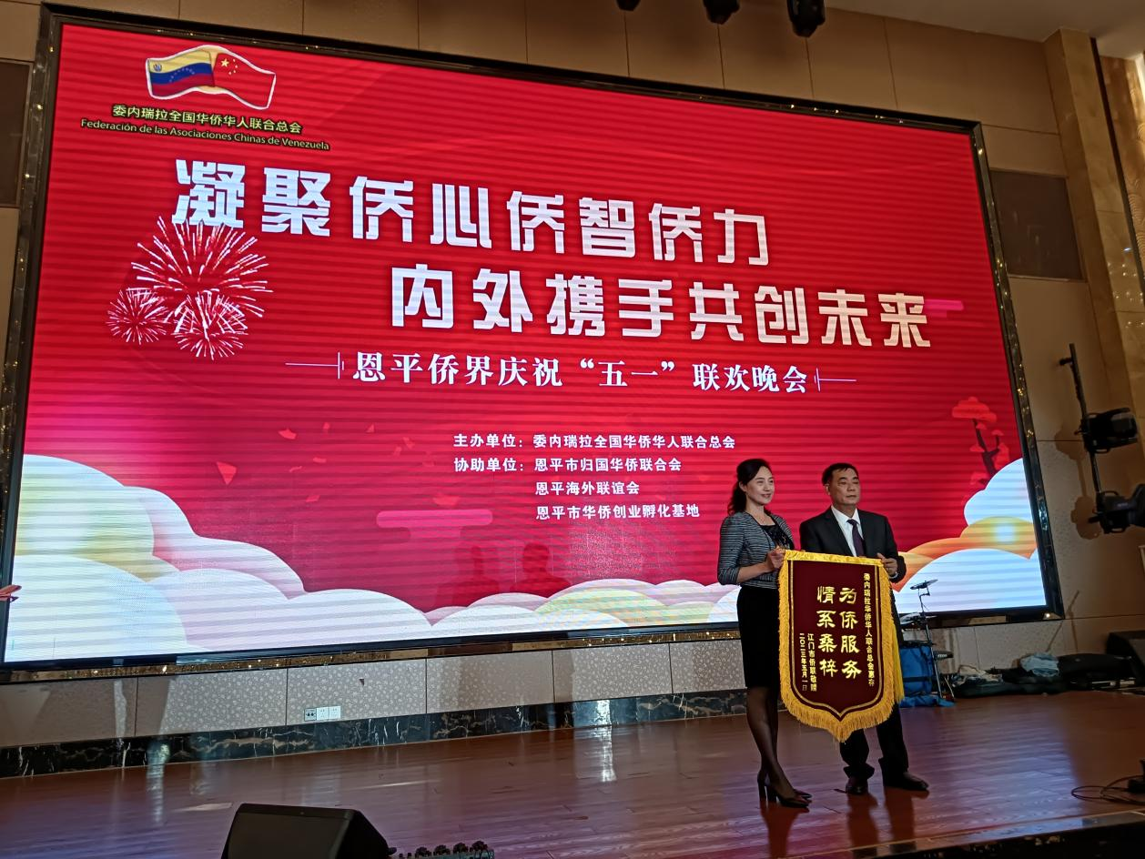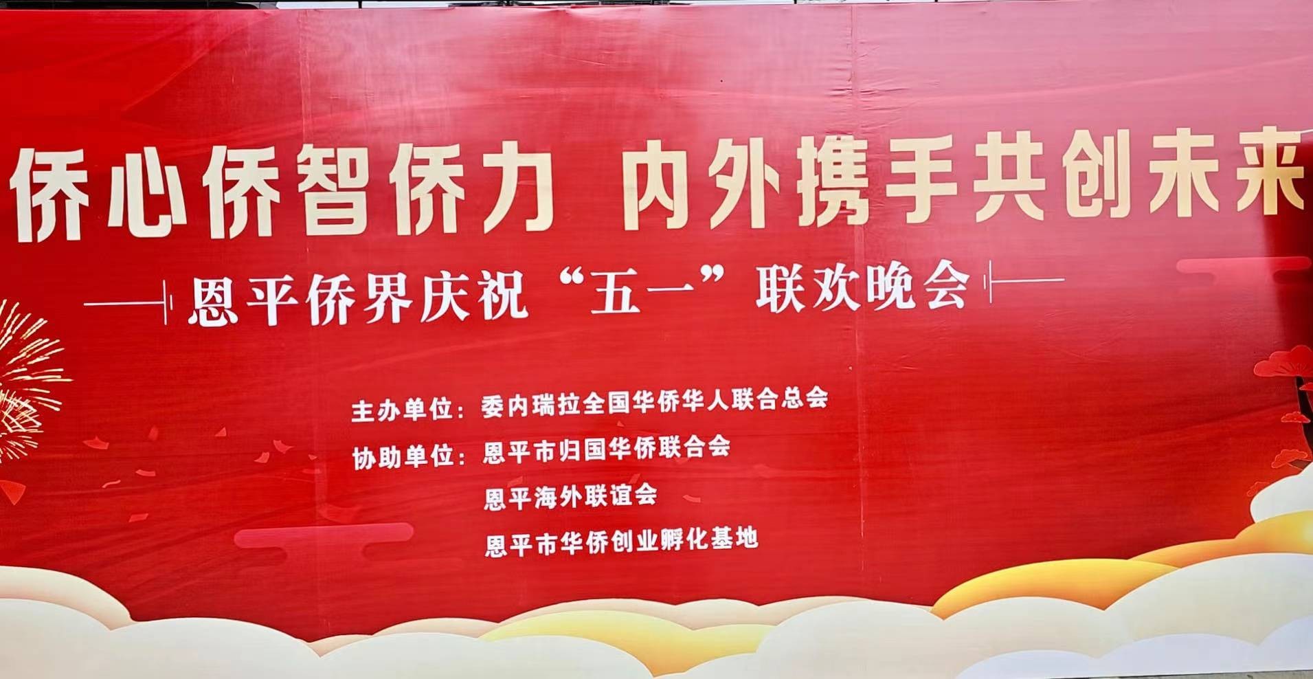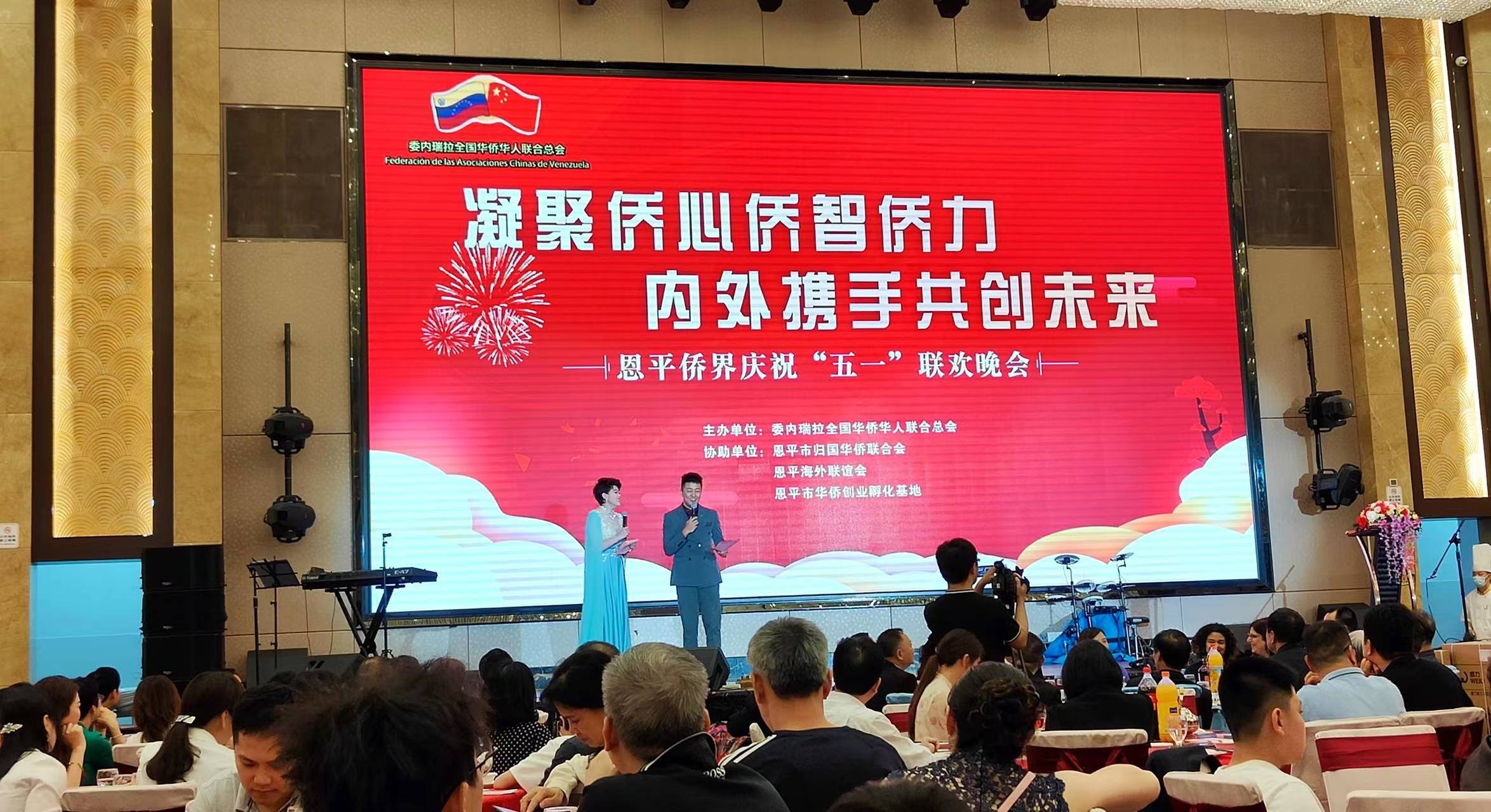 “凝聚侨心侨智侨力,内外携手共创未来——恩平侨界庆祝“五一”联欢晚会”由委内瑞拉全国华侨华人联合总会主办,恩平市归国华侨联合会、恩平海外联谊会、恩平市华侨创业孵化基地联合协办,广东省侨联副主席、江门市侨联主席林春晖,江门市侨联副主席郑文辉,恩平市政协主席吴永芳,恩平市领导黄嘉仪、何坚培、谢妙慈、梁朝贺以及委内瑞拉驻广州领事馆总领事车丽女士等出席晚会。