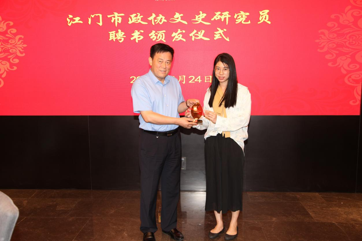 江门市政协副主席周津明(左)向文史研究员颁发聘书