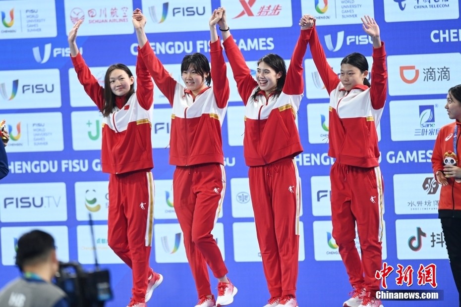 8月1日,第31届世界大学生夏季运动会女子4×100米自由泳接力决赛在四川成都举行,由李冰洁、柳雅欣、罗悠扬和张雨霏组成的中国队获得金牌。图为李冰洁、柳雅欣、张雨霏、罗悠扬(从左到右)站上冠军颁奖台。