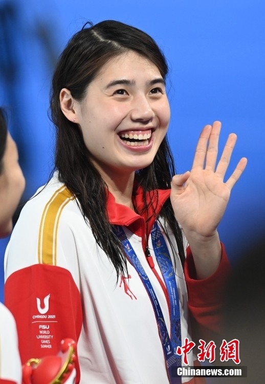 8月1日,第31届世界大学生夏季运动会女子4×100米自由泳接力决赛在四川成都举行,由李冰洁、柳雅欣、罗悠扬和张雨霏组成的中国队获得金牌。图为张雨霏在颁奖仪式后向观众致意。