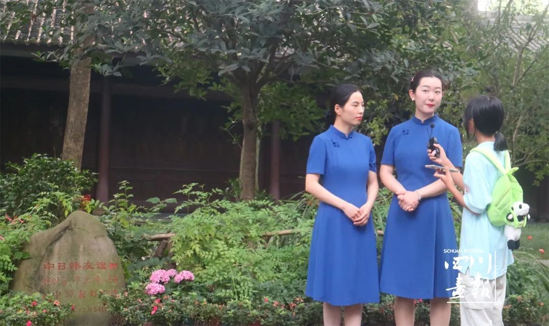 韩国小记者林秀璟在“中日韩友谊树”下采访讲解员