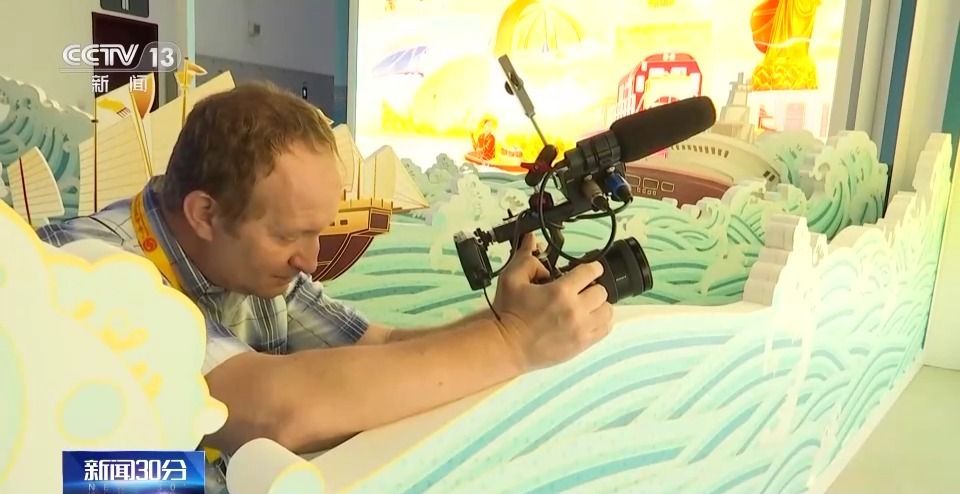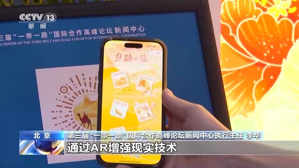 第三届“一带一路”国际合作高峰论坛新闻中心执行主任李华:“书画”中展示共建“一带一路”国家地标建筑和相关合作标志性项目,记者朋友可以通过手机扫码,通过AR增强现实技术,将古丝绸之路的场景叠加于书画上。