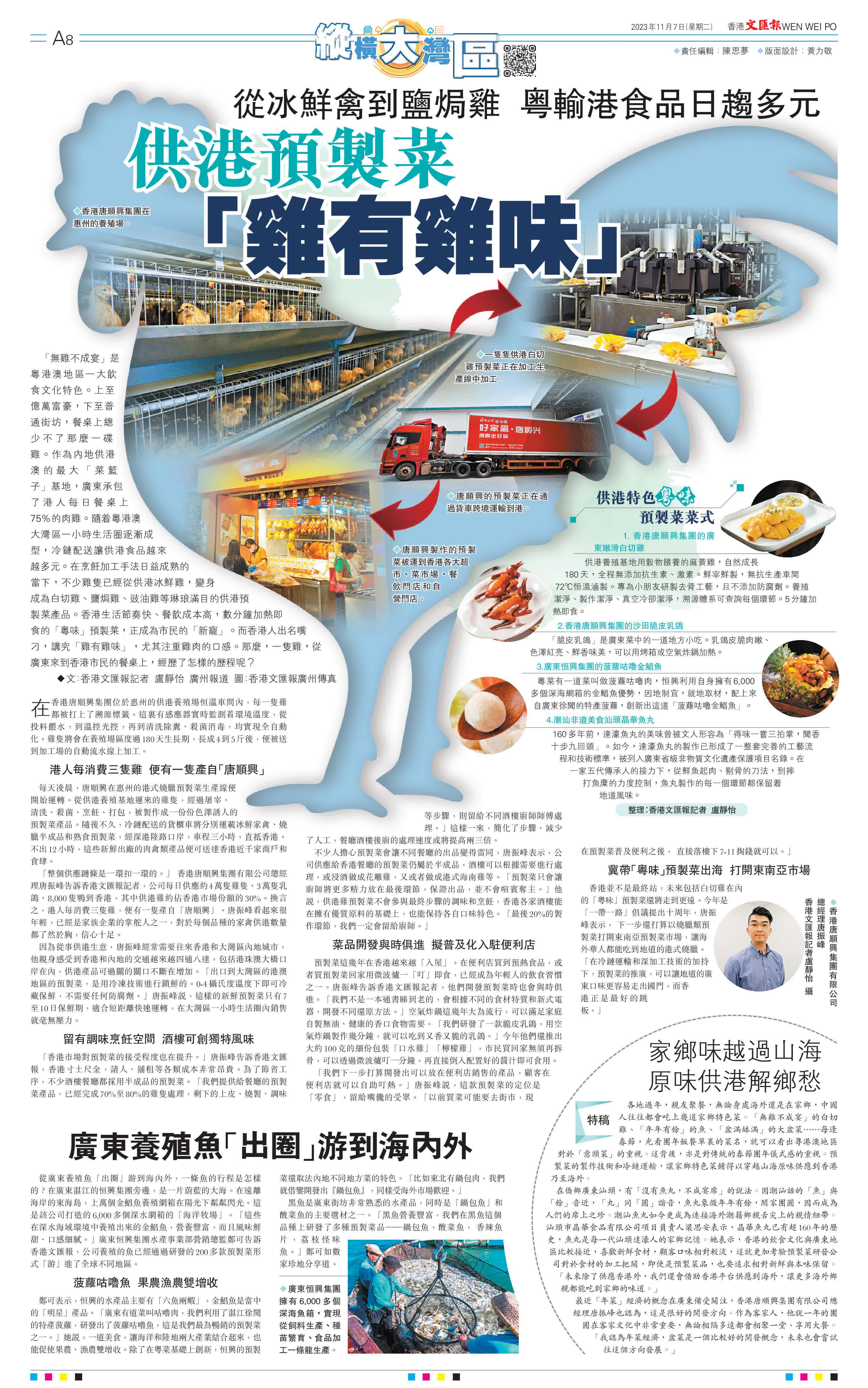 「香港市場對預製菜的接受程度也在提升。」唐振峰告訴香港文匯報,香港寸土尺金,請人、舖租等各類成本非常昂貴。為了節省工序,不少酒樓餐廳都採用半成品的預製菜。「我們提供給餐廳的預製菜產品,已經完成70%至80%的雞隻處理,剩下的上皮、燒製、調味等步驟,則留給不同酒樓廚師師傅處理。」這樣一來,簡化了步驟、減少了人工,餐廳酒樓後廚的處理速度或將提高兩三倍。