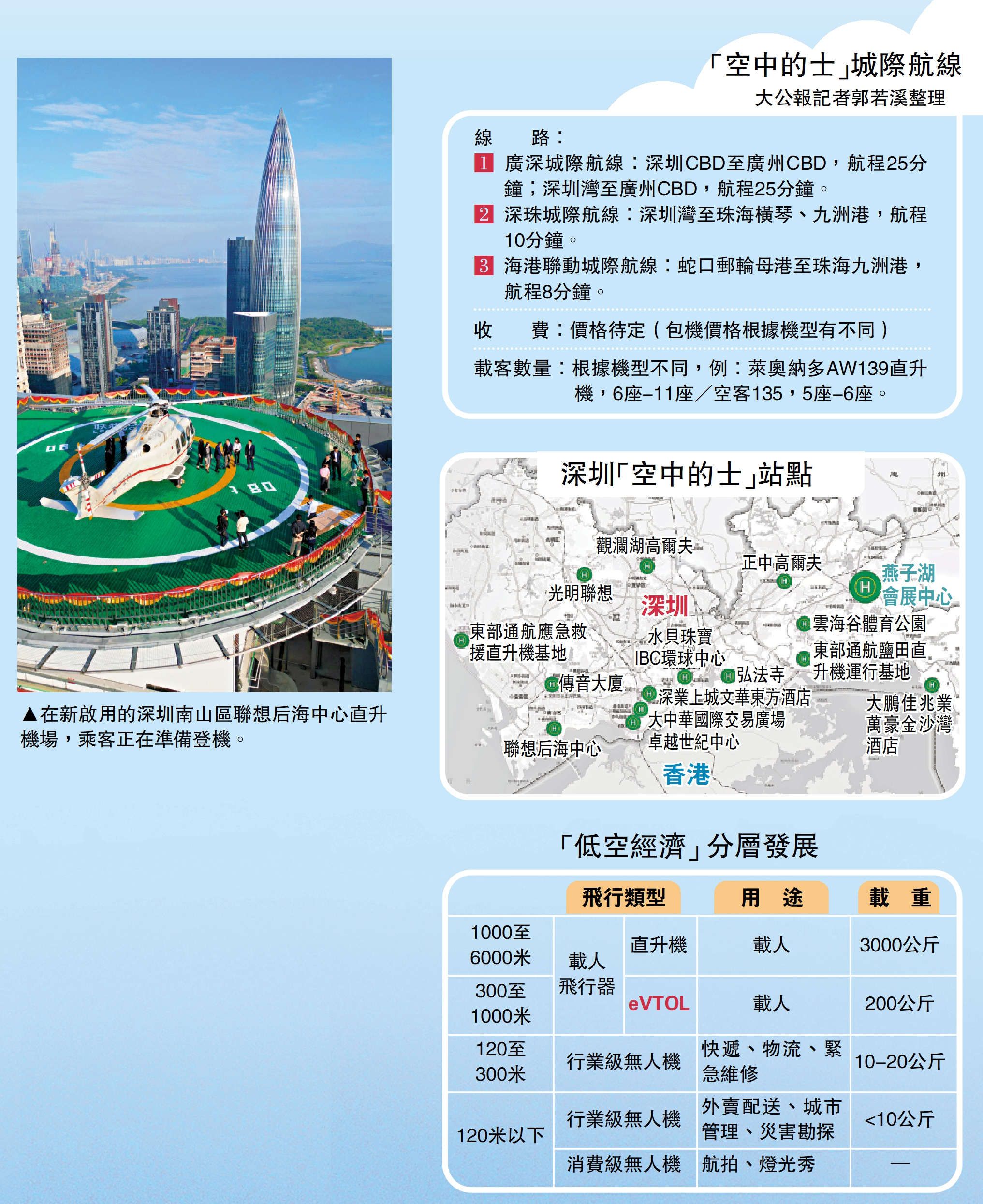(大公報 記者 郭若溪 深圳報道)深圳正加速布局「天空之城」,創新城市立體交通,多條城際「空中的士」直升機線相繼開通,織密灣區低空路網。近日,深圳聯想后海中心直升機場與城市候機樓正式啟用,搭乘「空中的士」由深圳灣至廣州25分鐘直達,形成深圳灣與粵港澳大灣區「9+2」城市群內各運輸機場、城市CBD、重點企業與廠區等起降點互聯互通。深圳交通部門並表示,將探索打造河套深港科技合作區與香港的跨境載人運輸通道和跨境貨運試點,持續豐富低空載人業態發展。