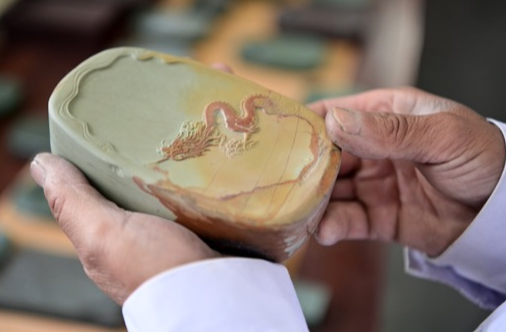 洮砚之所以名贵,是因为用来雕刻砚台的石料,其质地光细 如玉, 碧翠流波; 色调不淡不艳, 秀润雅嫩。