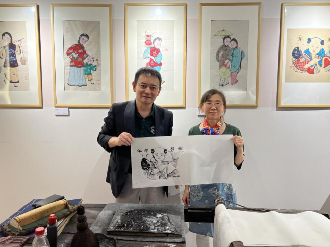 韩国新华报社长曹明权体验木版年画拓印制作。(刘强 摄)