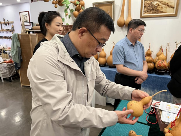 日本Trip7控股集团董事长郑继飞观摩葫芦烙画。(刘强 摄)