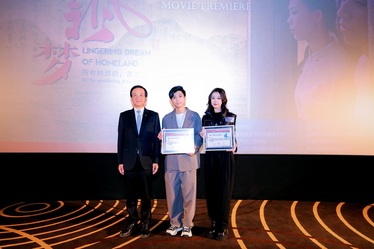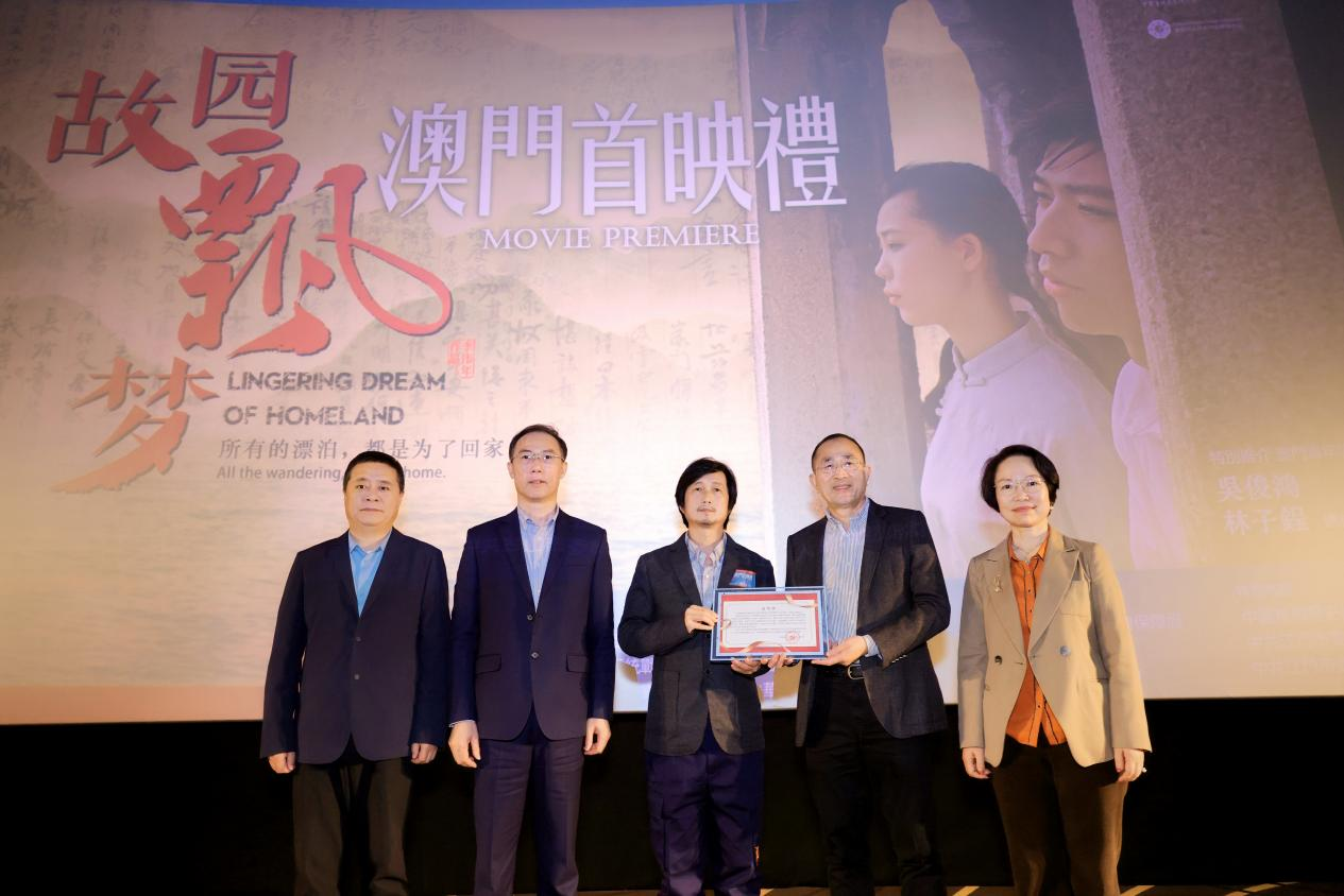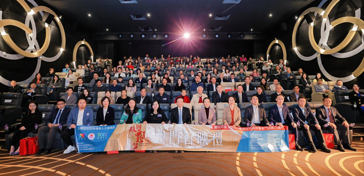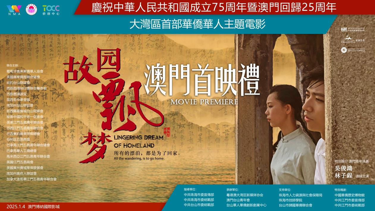 在中国澳门,为促进华侨华人文化的传承与发展,由二十多个海外华侨社团携手本地团体等联合主办的大湾区首部华人华侨电影《故园飘梦》,1月4日下午在澳门博纳国际影城首映,冀藉影片促进澳门与湾区各市的文化交流,增进华侨华人的身份认同和文化自信。主办方华侨代表雷康宁表示:这部影片讲述华人华侨人在海外的漂泊史与文化追寻,深有共鸣,让他们重新审视身份,并呼唤年轻一代继续传承这份文化,希望这部电影能激励更多人去了解和珍视华侨华人的历史贡献。承办方代表、澳门台山青年会理事长伍剑佐表示:澳门青年在粤港澳大湾区中扮演着重要的角色,吴俊鸿和林子锃两名青年这次作为电影主演,不仅是参与者,更是受益者;澳门青年通过参与大湾区的各种活动和文化体验,见证并参与改革与发展,找到了属于自己的机遇与责任。承办方代表、粤港澳大湾区新媒体协会副会长兼秘书长杜燕红表示:该电影致力挖掘侨乡历史,尊重史实,片中还原大量的广东民俗文化,是一部原汁原味的岭南侨乡风情电影;在澳门首映,可为本土电影产业注入一股新力量,也为澳门观众打开一扇了解华侨历史、感受华侨文化的视窗。根据活动主办方介绍,此次澳门电影首映活动是自黄茅海大桥开通后,海外二十多个华侨社团联合牵头主办,首个由澳门、珠海、台山三地共同参与的一个文化活动,现场有来自世界各地多位侨界领袖参加,各地代表皆希望筹拍第二套同主题电影,延续《故园飘梦》的家乡情怀。澳门全国人大代表、中国侨联副主席刘艺良和珠海市统战部代表分别为影片男女主角和导演李伟年颁发嘉奖状,表彰他们为大湾区的文化事业交流、走向世界做出的努力。出席当天活动的嘉宾还有:澳门中联办协调部代表尹小兰、澳门文化局代表何鸿斌、澳门旅游局代表熊蓓玲、澳门旅游发展委员胡惠芳、珠海市委统战部副部长邹焕忠、珠海市委党史研究室副主任张红梅、台山市委常委兼统战部部长李白云、珠海市人力资源与社会保障局副局长全冠、珠海市技师学院院长黄国军、台山市归国华侨联合会主席陈达旋等。(江门市侨媒中心:黄柏军、李伟年/摄影报道)