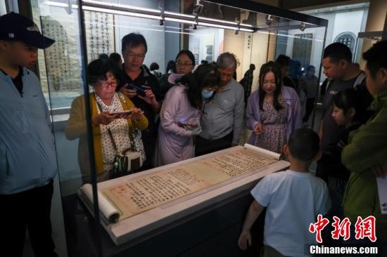 资料图为2024年2月1日,在海南省博物馆举行的“千古风流不老东坡——苏轼主题文物展”上,苏轼《新岁展庆帖》《人来得书帖》合卷吸引参观者。