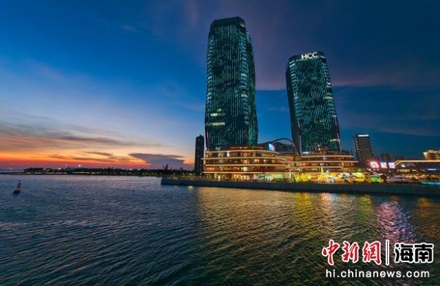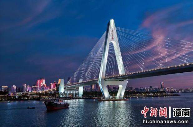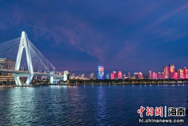 6月10日晚,海南海口,海口湾夜色璀璨,霓虹倒映水面。滨海大道的楼宇与世纪大桥交相辉映,尽显热带滨海都市的浪漫与活力。