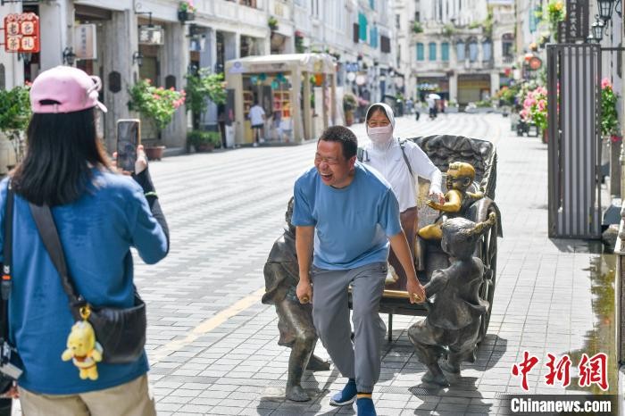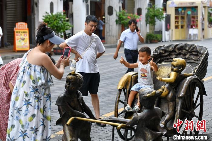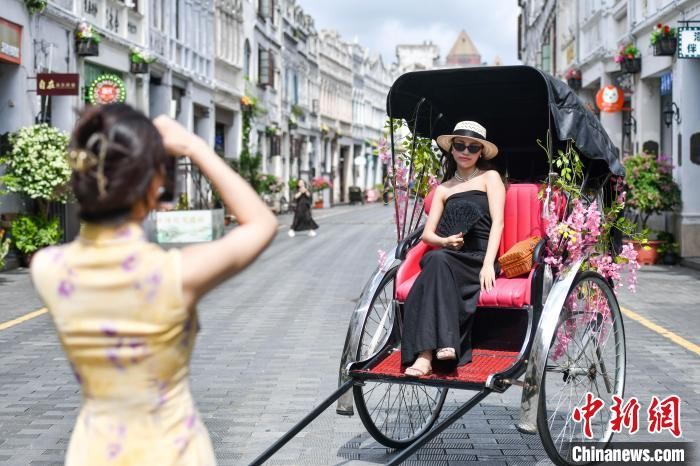 6月11日,海口百年骑楼老街的南洋风情建筑群重现昔日繁华,迎来八方游客。游人穿梭其间打卡拍照,沉浸式感受中西合璧的南洋文化。图为游客坐在黄包车上打卡拍照。中新社记者 骆云飞 摄