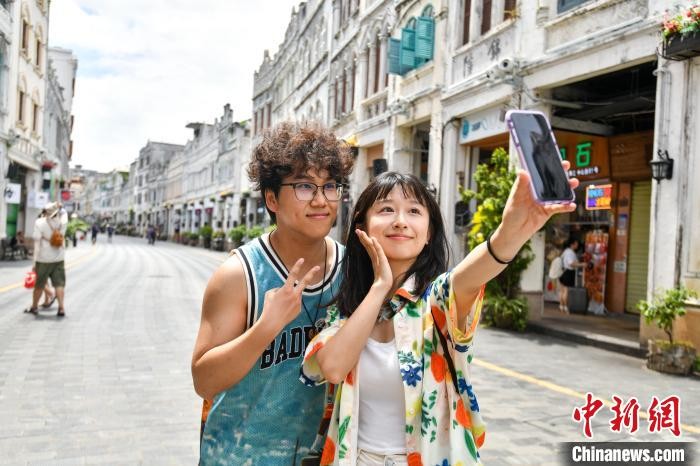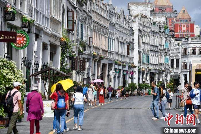 6月11日,海口百年骑楼老街的南洋风情建筑群重现昔日繁华,迎来八方游客。游人穿梭其间打卡拍照,沉浸式感受中西合璧的南洋文化。中新社记者 骆云飞 摄