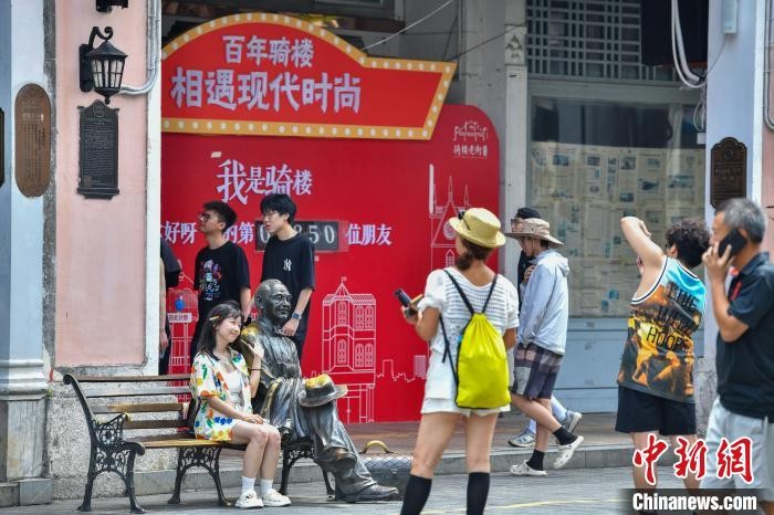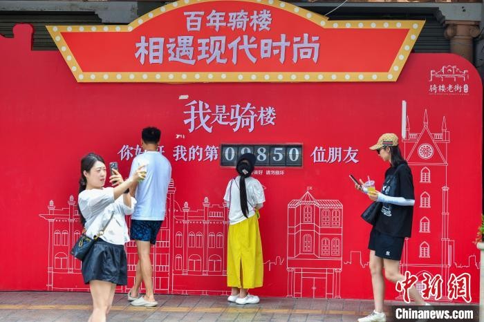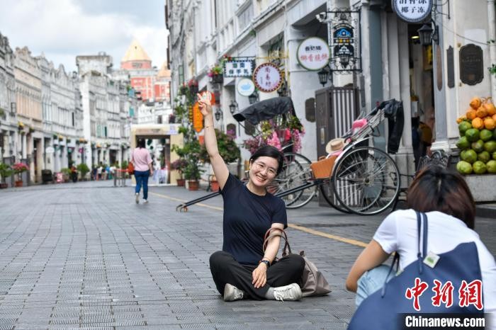 6月11日,海口百年骑楼老街的南洋风情建筑群重现昔日繁华,迎来八方游客。游人穿梭其间打卡拍照,沉浸式感受中西合璧的南洋文化。图为游客在海口骑楼老街打卡拍照。中新社记者 骆云飞 摄