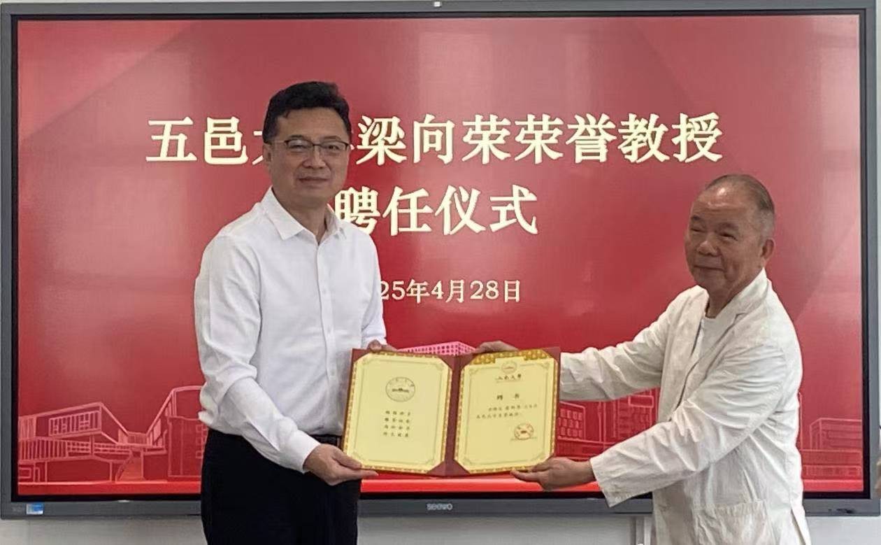 图为梁向荣先生被聘任为五邑大学荣誉教授