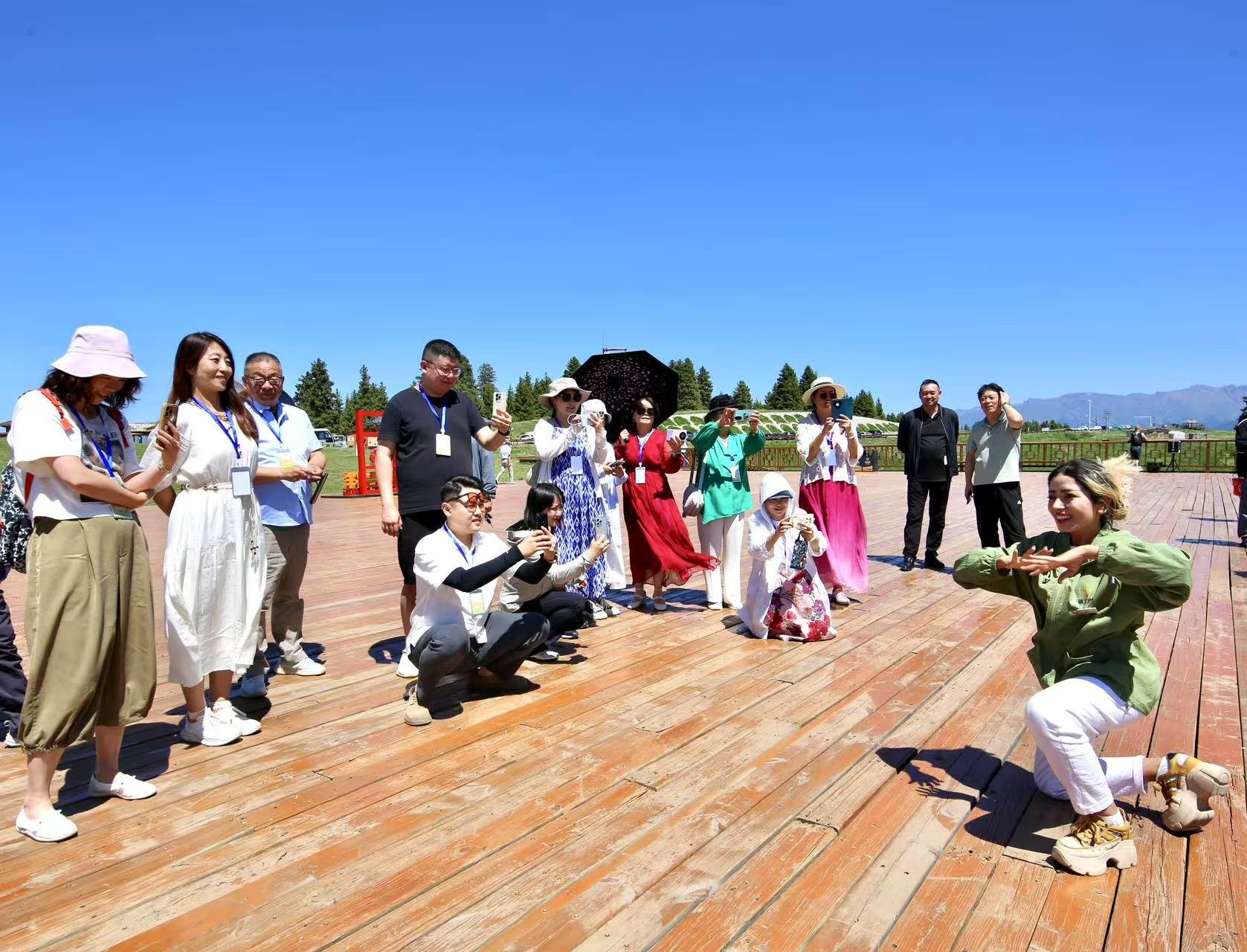 随后,采访团来到江布拉克花海子,这里地势险峻,山峦叠嶂,繁花似锦,犹如大地铺上了五彩斑斓的织锦。正当大家沉醉于壮丽景色时,新疆导游小耶突然放起欢快的维吾尔族音乐,邀请大家一同跳舞。