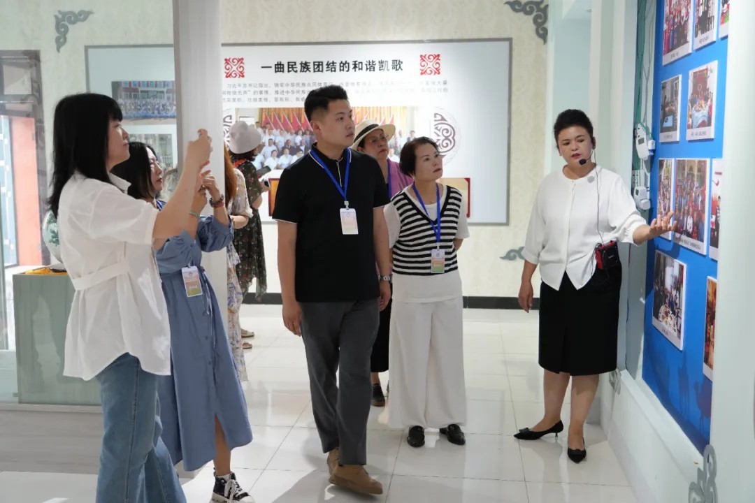 采访团一行参观塔城市新城街道哈尔墩社区⺠族团结展馆。